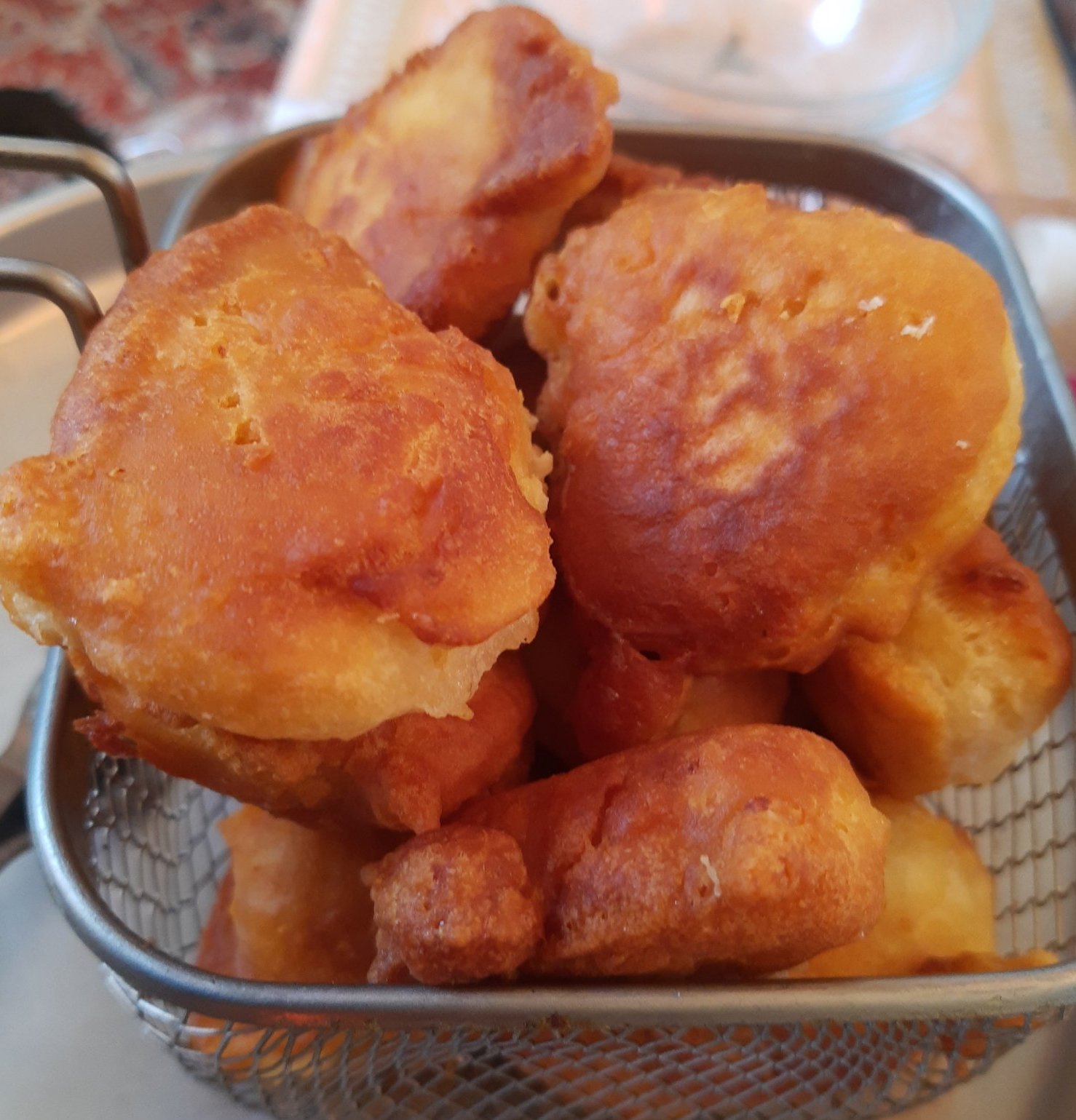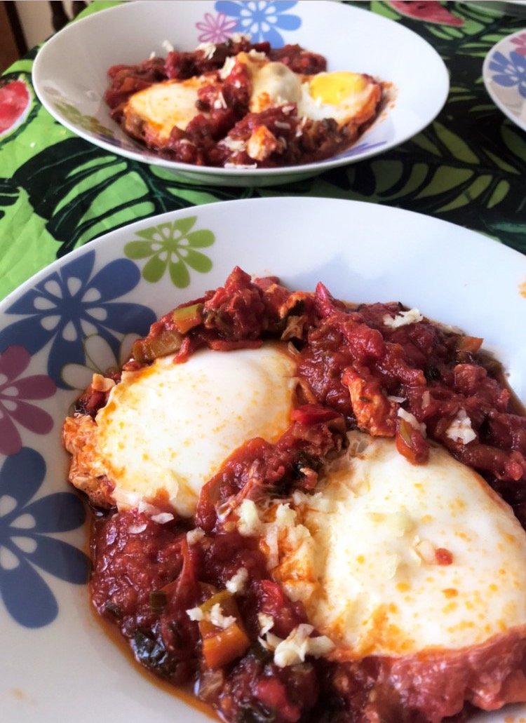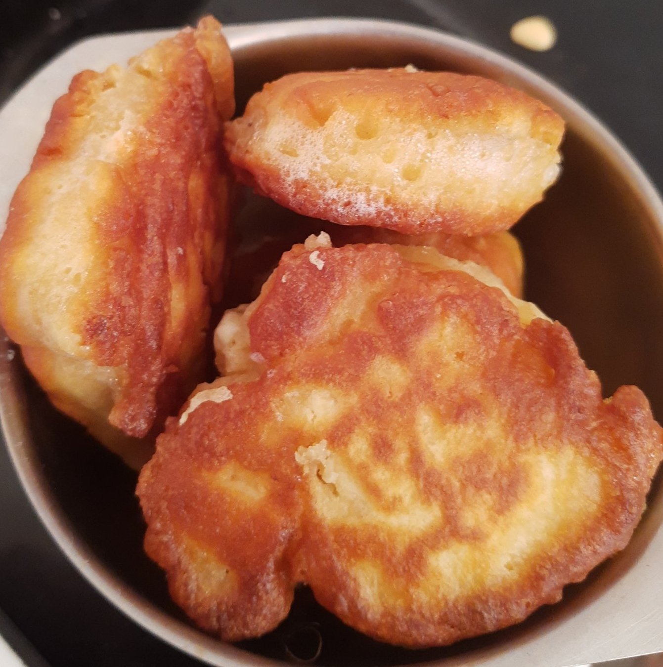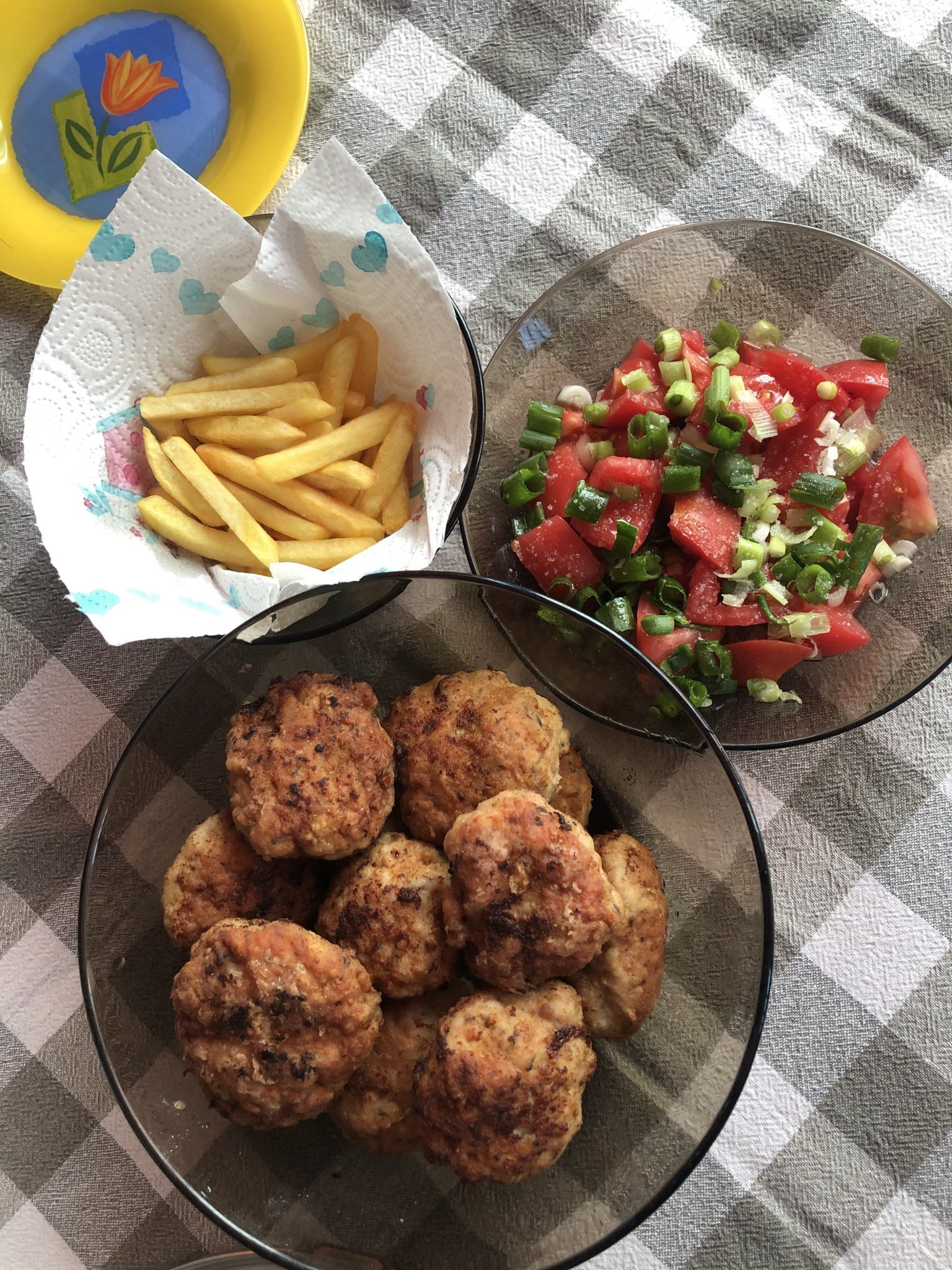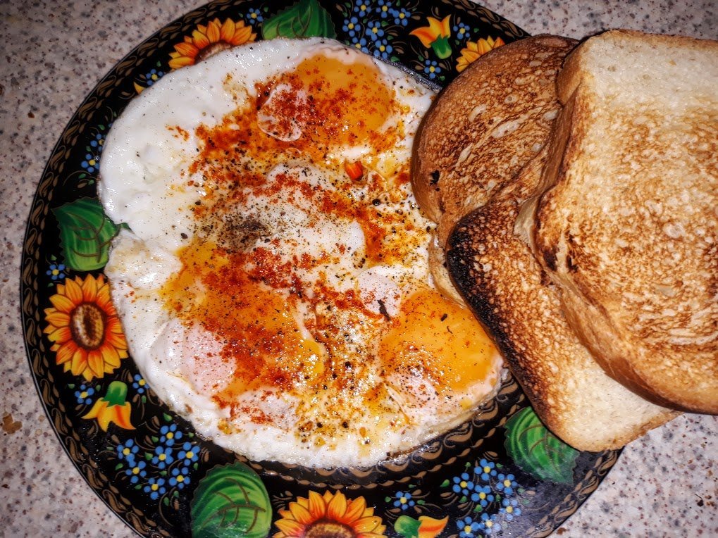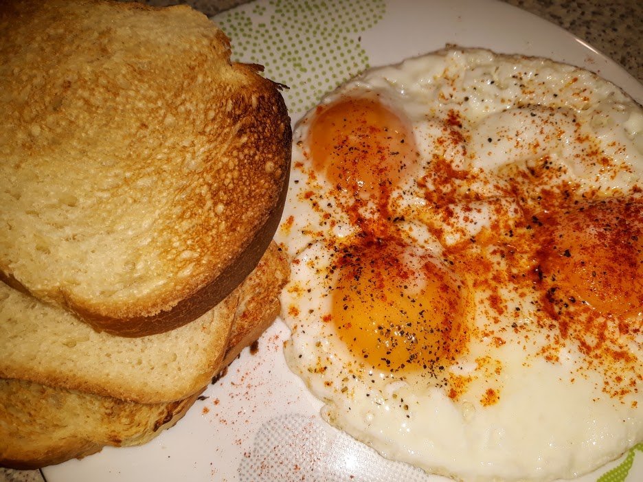 Яйца на очи за мен и внука с показания по-долу хляб.Иначе мусака правих, и пици купешки ядохме.