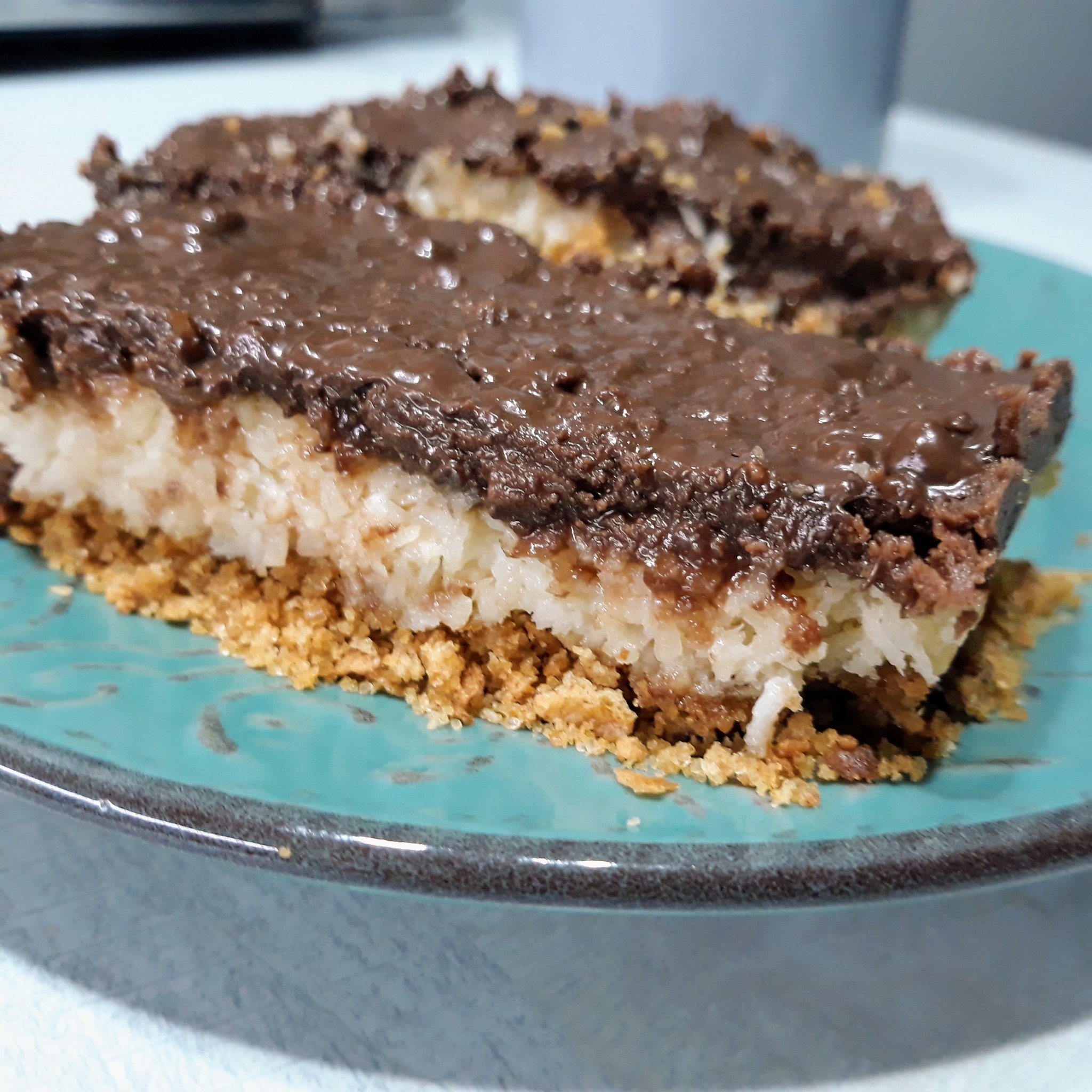 Десерт - тук още не е стегнал, но се оказа много вкусен, поне за мен. Основата - масло и пълнозърнести бисквити, после кокосови стърготини и кондензирано мляко и разбира се - шоколад Yum