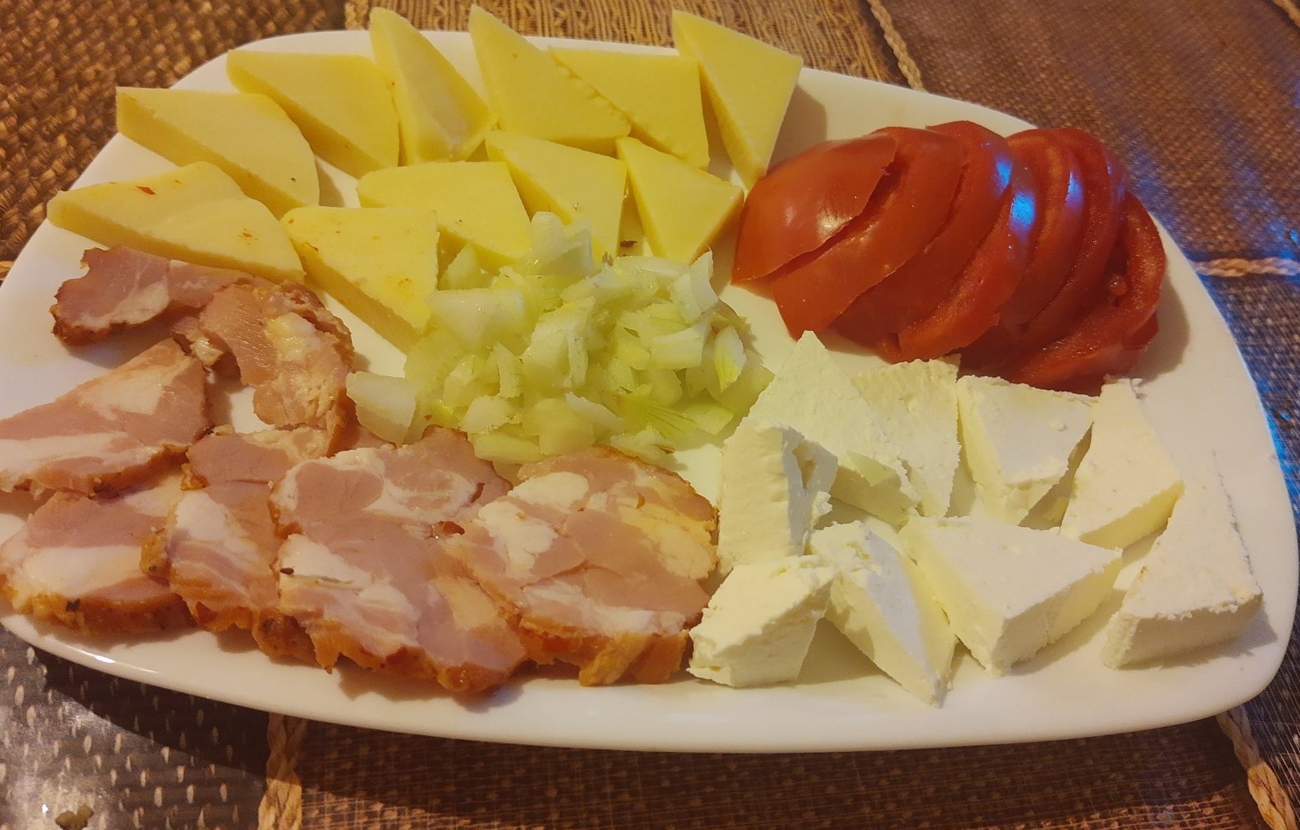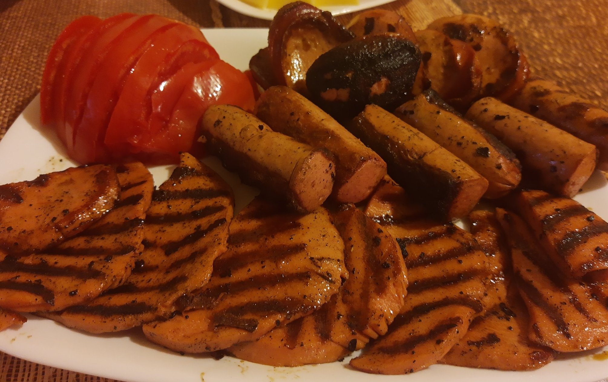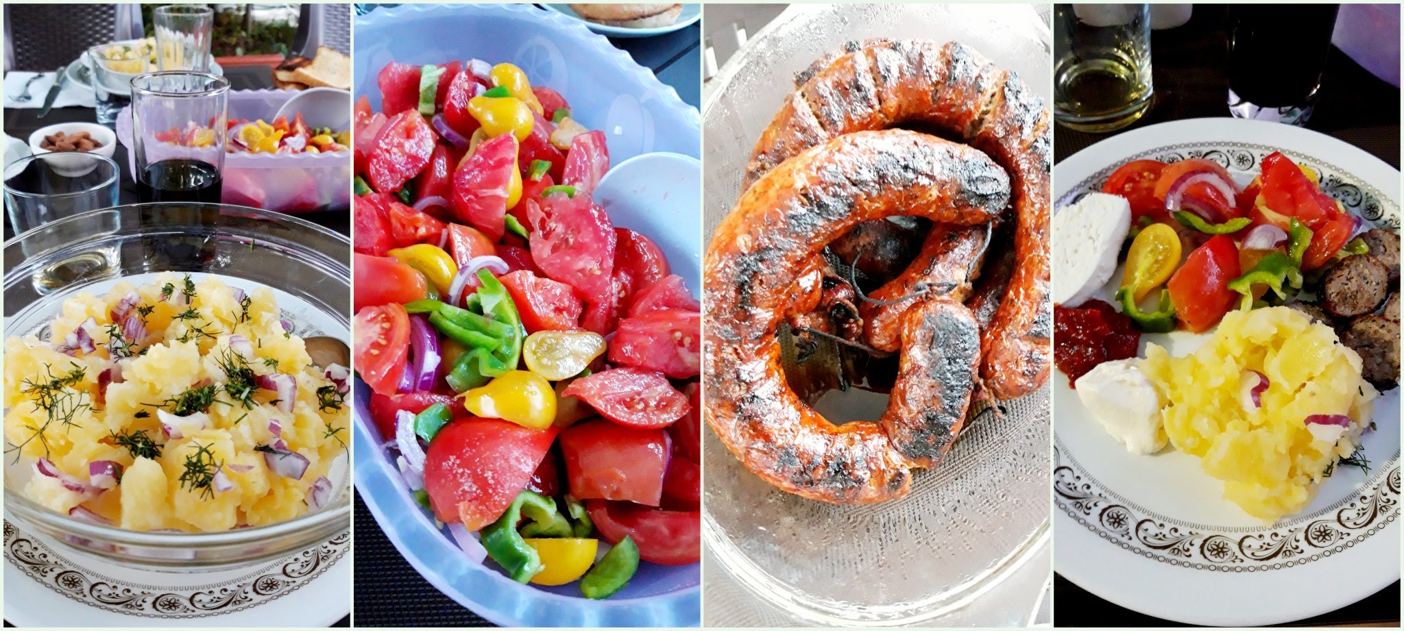 Любима топла картофена салата; доматена с лук и зелен пипер; суджук на барбекюто.