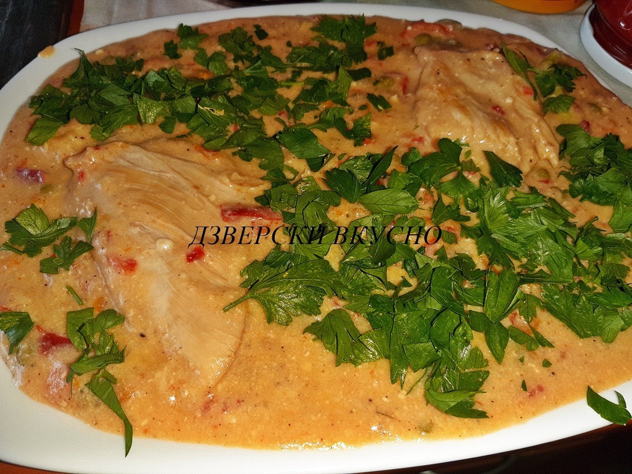 и за да не е съвсем напразно - едно продължение на същата тема, пилешки гърди в сос от сирена