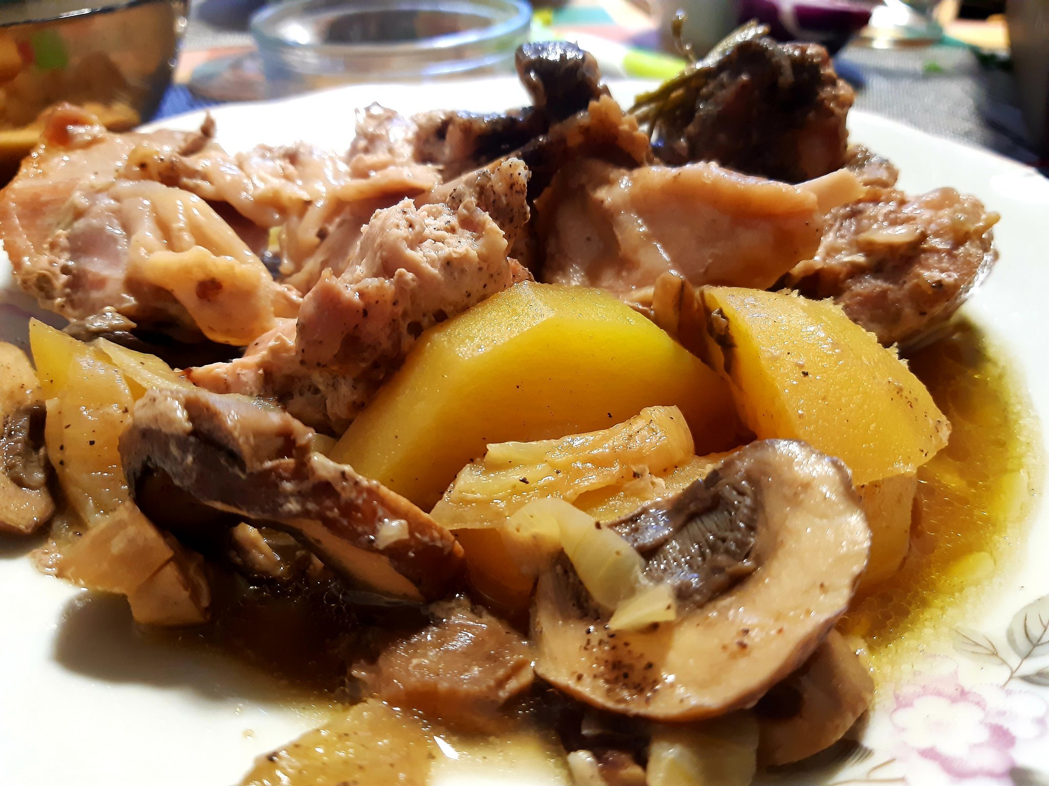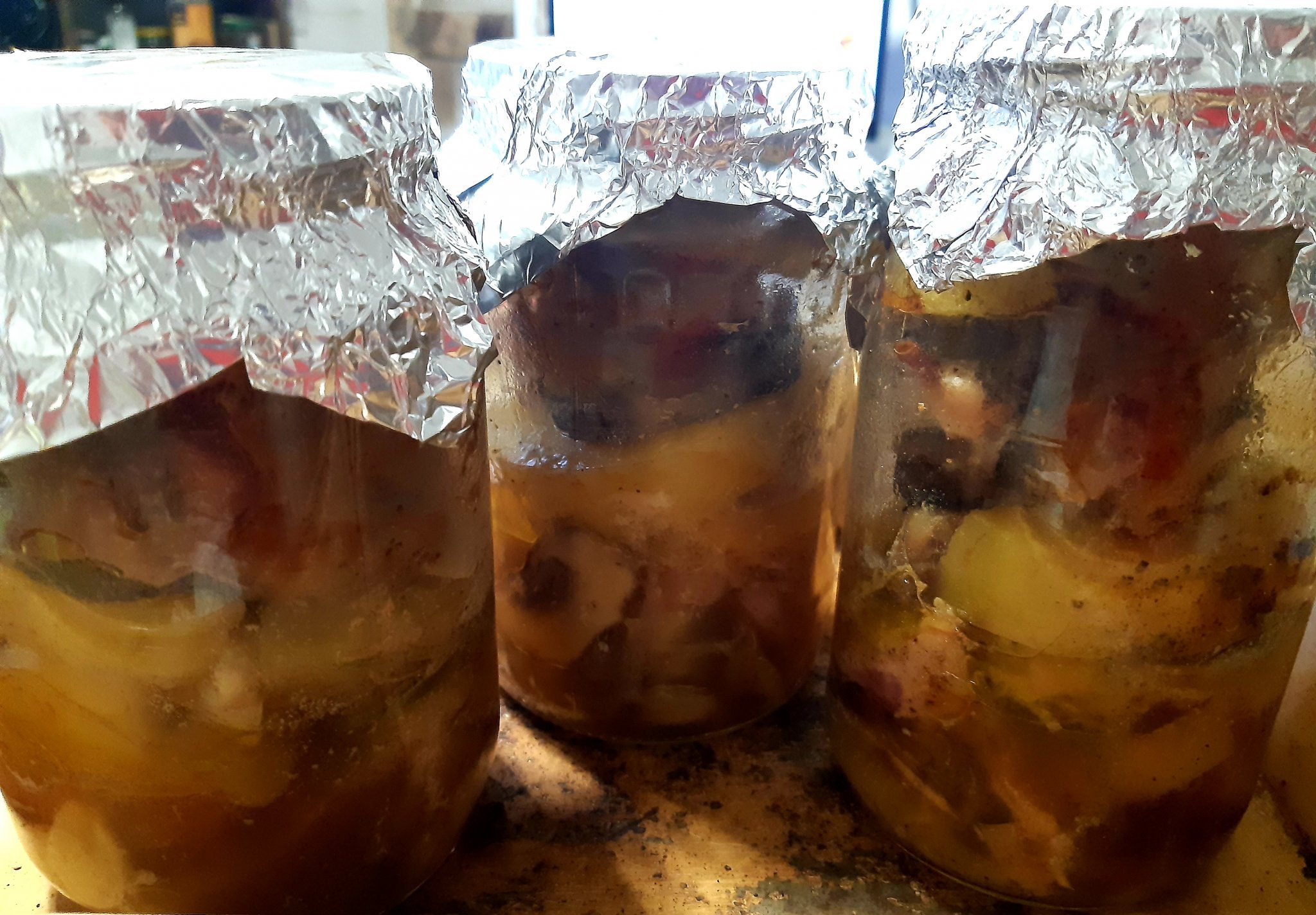Снощи готвих в буркан (зарибих се от една "диетична" тема)- пуешко бутче, картофи, гъби, масълце, подправки.