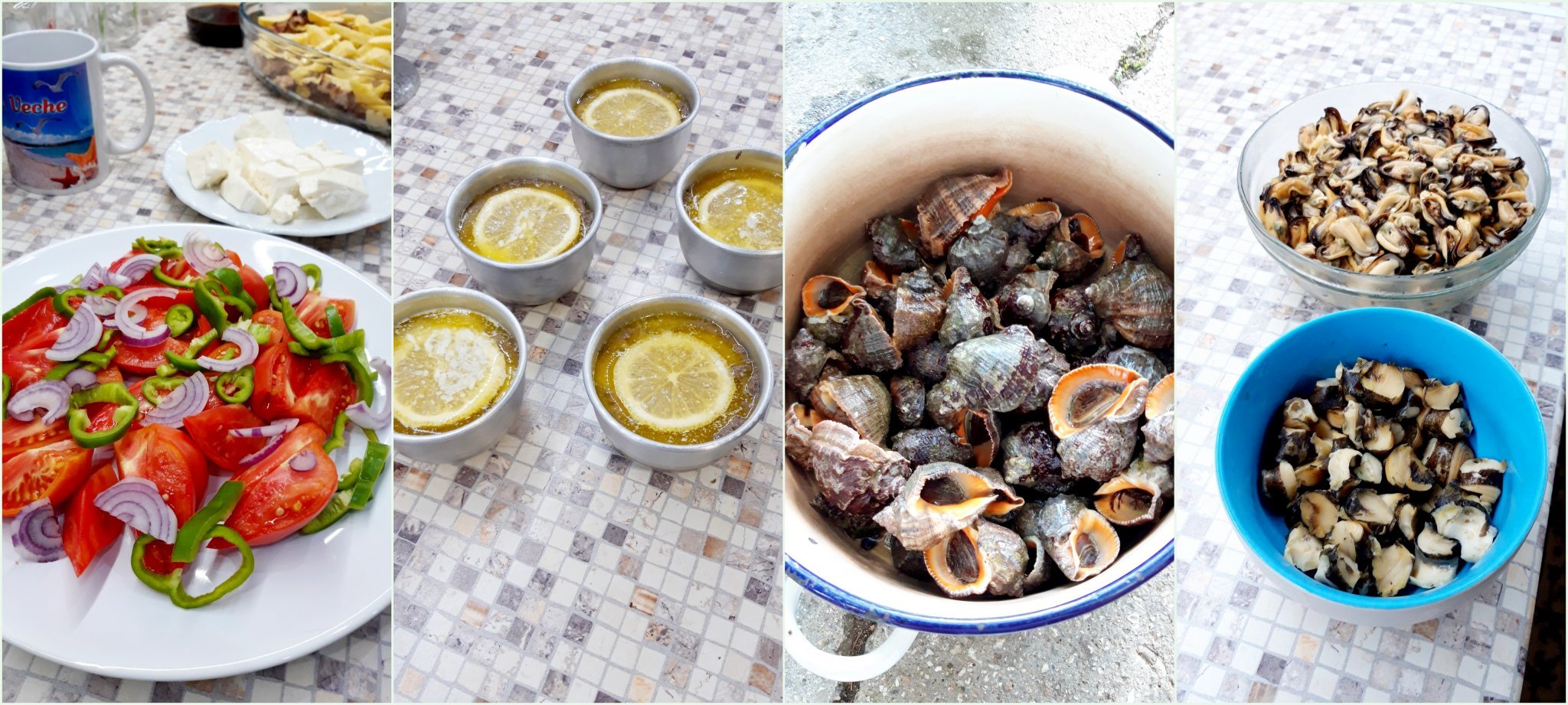 Салата; пастет от свински дроб; миди и рапани ( мидите на салата, а рапаните ще са панирани).