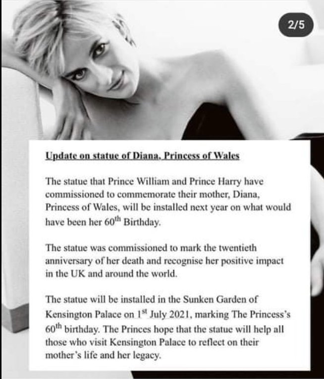 Статуята ще бъде поставена в "Потъналите градини" на Кенсигтън, на 1 юли 2021 г., отбелязвайки 60- я рожден ден на Даяна. Принцовете се надяват, че статуята ще помогне на всички посещаващи да отразят живота на майка им и нейното наследство.
