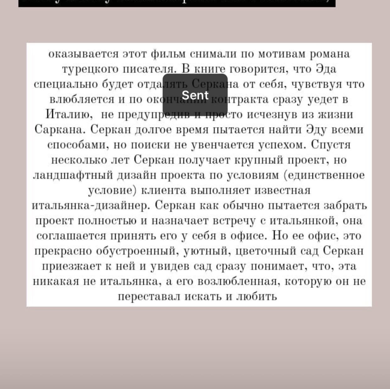 Оказва се, че сериала е заснет по мотиви от роман на турски писател / неизвестни засега/. Когато разбира, че се влюбва Еда сама ще се отдалечи от Серкан. Ще замине за Италия, където ще завърши и ще се реализира . Серкан ще я търси навсякъде със всички методи без успех. След години получава голям проект, като единствено условие е ландшафния дизайн да се изпълни от известна италианска дизайнерка. Той иска среща с нея и тя се съгласява, като се оказва , че нейния офис е красива градина. Той разбира, че е творение не на италианка, а на неговата бивша " годеница". Имаше назад в епизодите такъв вариант. След години Еда и Серкан да работят заедно.