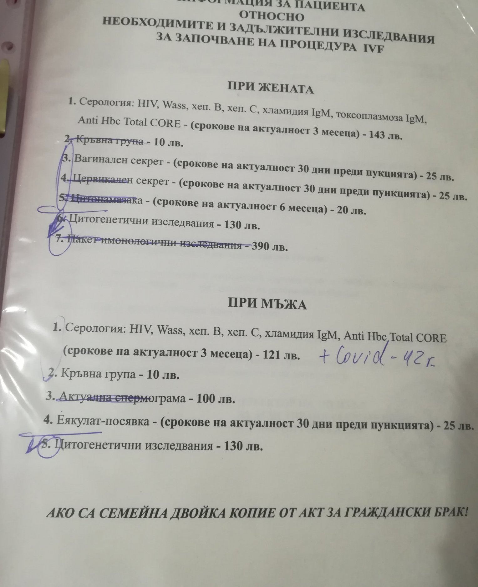 А това са другите изследвания, които ние си ги поемаме. Всичко е задължително ( цитогенетичните изследвания са по преценка на доктора). Също пълна кръвна картина няколко пъти, урина, хормони като надвишиш 10-те броя, поети от фонда и т.н.