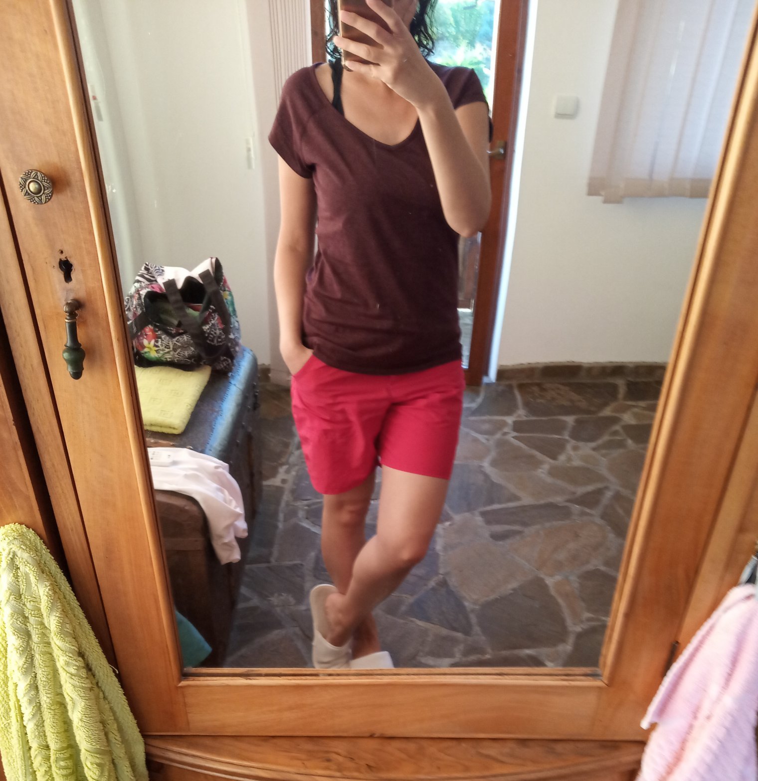 Бегаческато екипче за топлите дни на годината. За долнище (шорти, клинове) харесвам hm, сутиените са винаги Brooks, а маратонките Saucony. Към спортните стоки съм много по-лоялна от другите неща, които нося. И по принцип имам спортни обувки само за бягане. Хич не е мой спортният стил извън тичането.