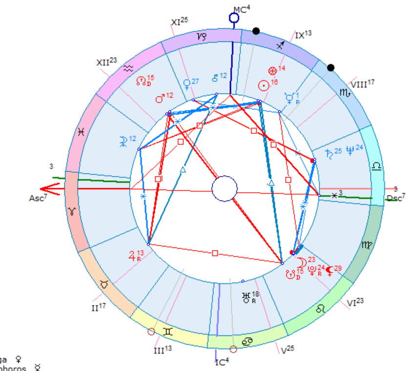 Така излиза, че моята Венра, от която тръгна приказката (в Скорпион, 8 дом) е заточена по знак и дом, но пък с достойнство по триплицитет и управител на триплицитета (дневно раждане).
