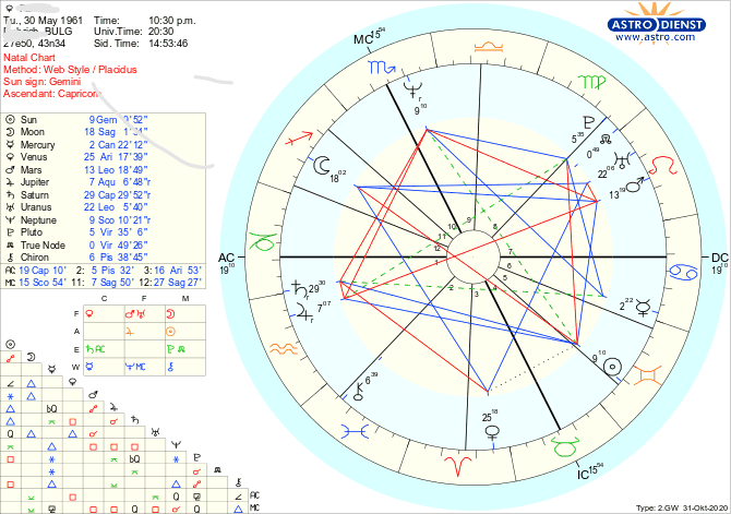 Да, трудности в семейния живот и едно креативно-ексцентрично съзнание пълно с идеи, адаптивна личност. 30 Май прихваща от окото на бика, марсова натура и в опозиция с Антарес... личност, която се възмущава и се бунтува срещу лъжата и изкривяването на истината. През свободното си време мисли за къщата кое как ще направи, както и за пътувания, пред хора как ще се представи.