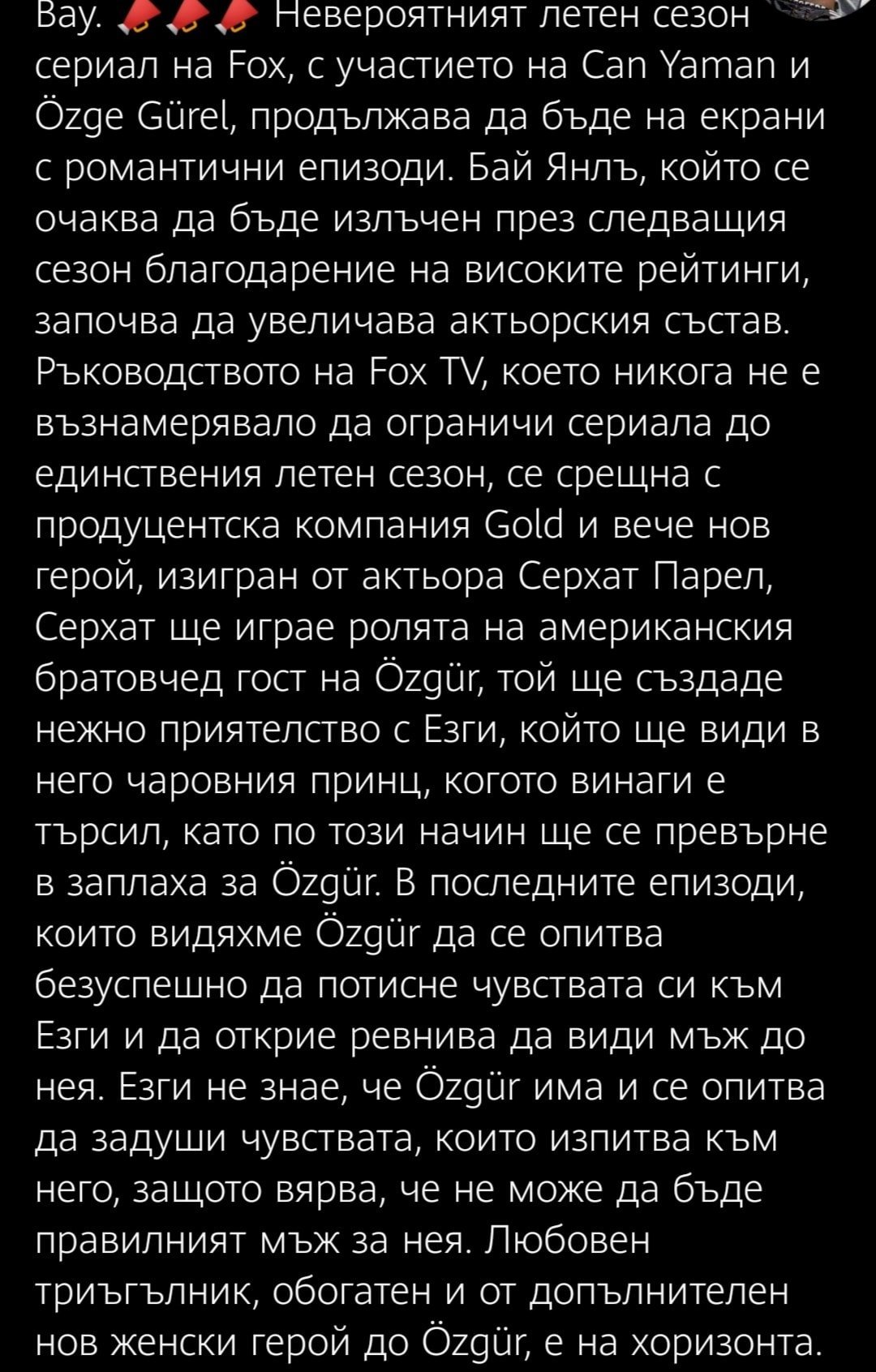 Иска ми се да видя как този нов образ също се влюбва в Езги - не по неправилните причини, както говедото Сонер или лукавия Сердар, а заради нея самата. Да бъде достоен съперник на Йози, за моментите, в които съм сигурна, че предстои да я огорчи, макар и не по негово желание.