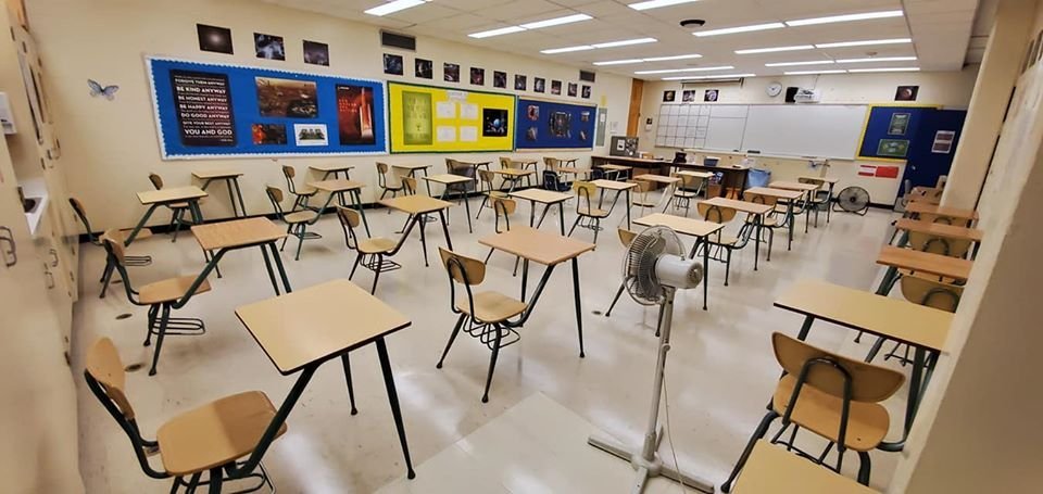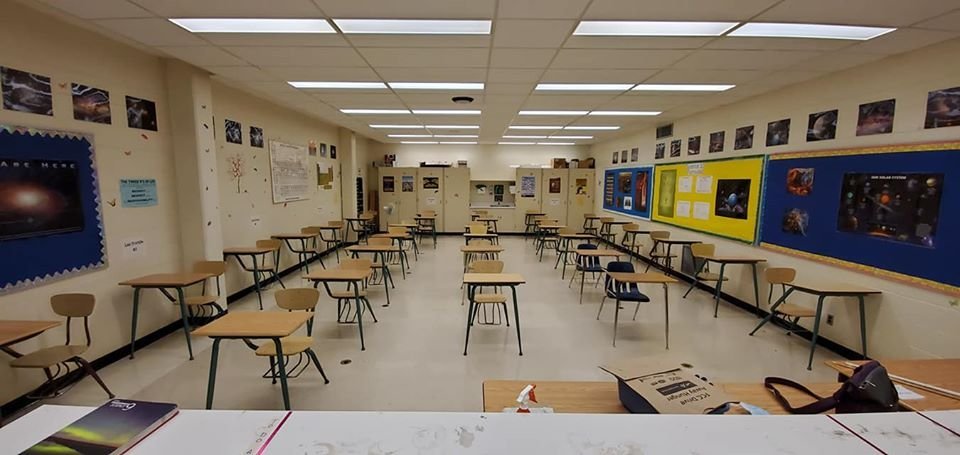 Ето какво публикува една учителка в града ни, като показваше как си е наредила чиновете и как с метър върви между тях за да имат метър дистанция. Но нейната класна стая е огромна, на фона на нормалните класни стаи и се е получило добре.