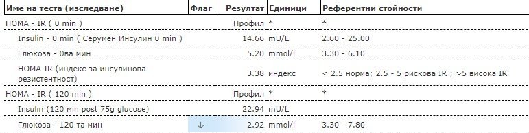 Има ИР, да не говорим, че инсулинът е висок и в началото преди обременяването. В края на изследването си в състояние на хипогликемия (под 3.9 mmol/l). Не съм лекар, но от изхождайки от собствения ми опит, това мисля.