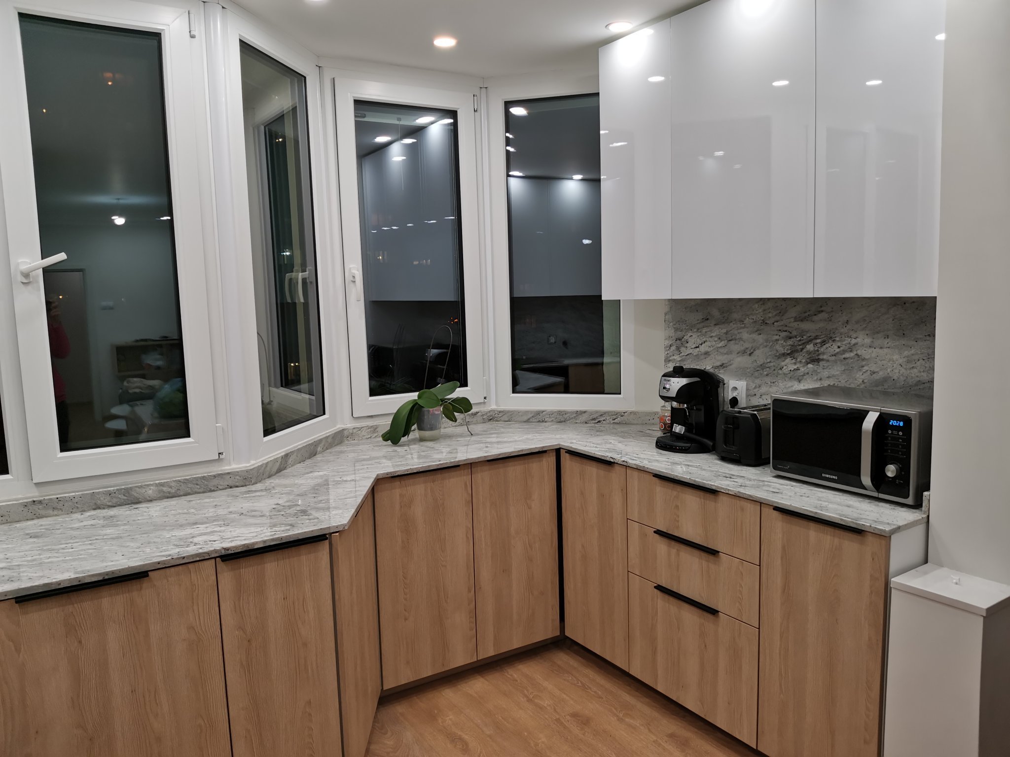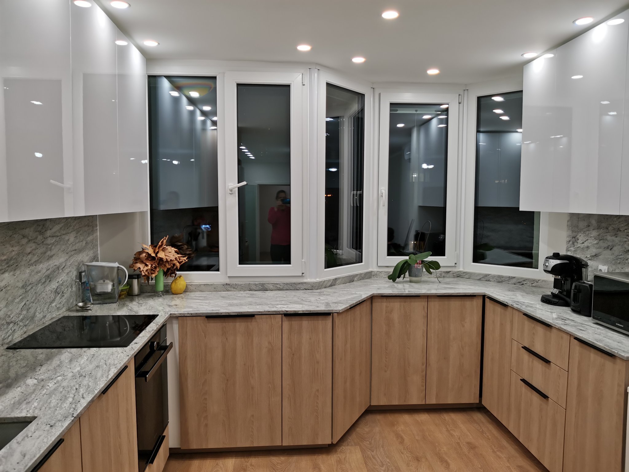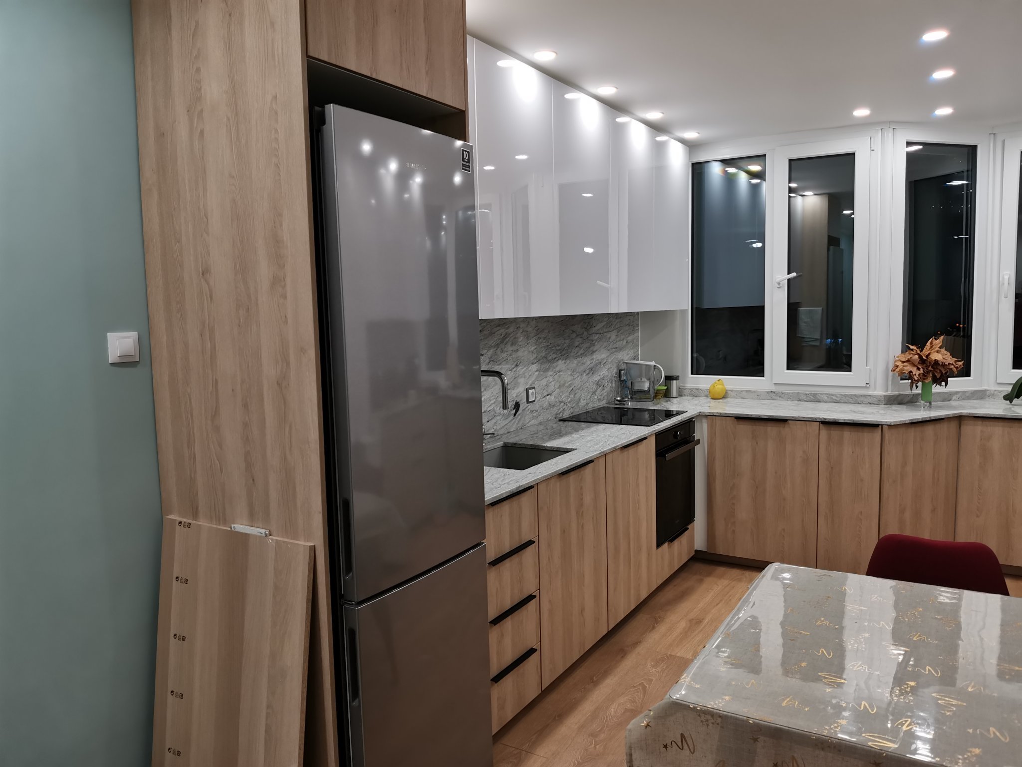 Не е съвсем готова, но понеже я правихме почти сами и след цялото друго ремонтиране и пренасяне не ни е останала сила да довършим. Липсва осветлението под шкафовете, едни бленди на ъгловите шкафове и перде. Мивката е бланко. Лесно се поддържа, но ние сме тук от 3 седмици и не мога да кажа дългосрочно как ще е.