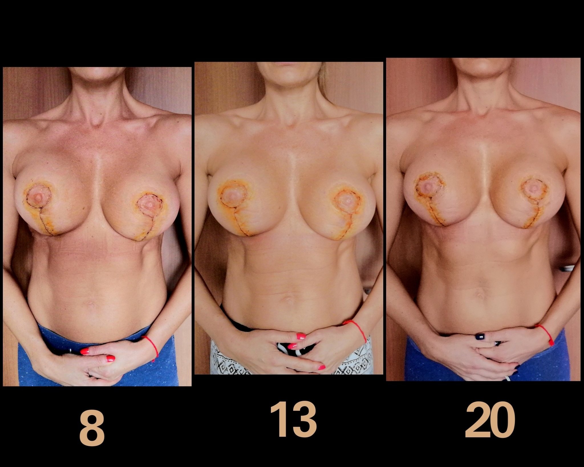 Здравейте,ще пусна снимка на моето развитие от първия ден без превръзки до 20 тия.Едната гърда-дясната,която беше с оток и високо започна леко да се оправя,но другата пък пада като истинска върху гръдния кош- стои като естествено увиснала гърда🙄 Това нормално ли е или има нещо,което не е Ок?Много го мисля,гледам други снимки и не виждам точно такова нещо или просто не мога да преценя.