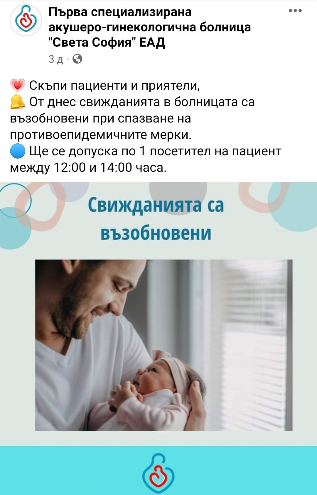 Момичета, свижданията са възобновени по едно лице на пациент между 12-14 ч. 🙏🏻 Дано се задържи така.