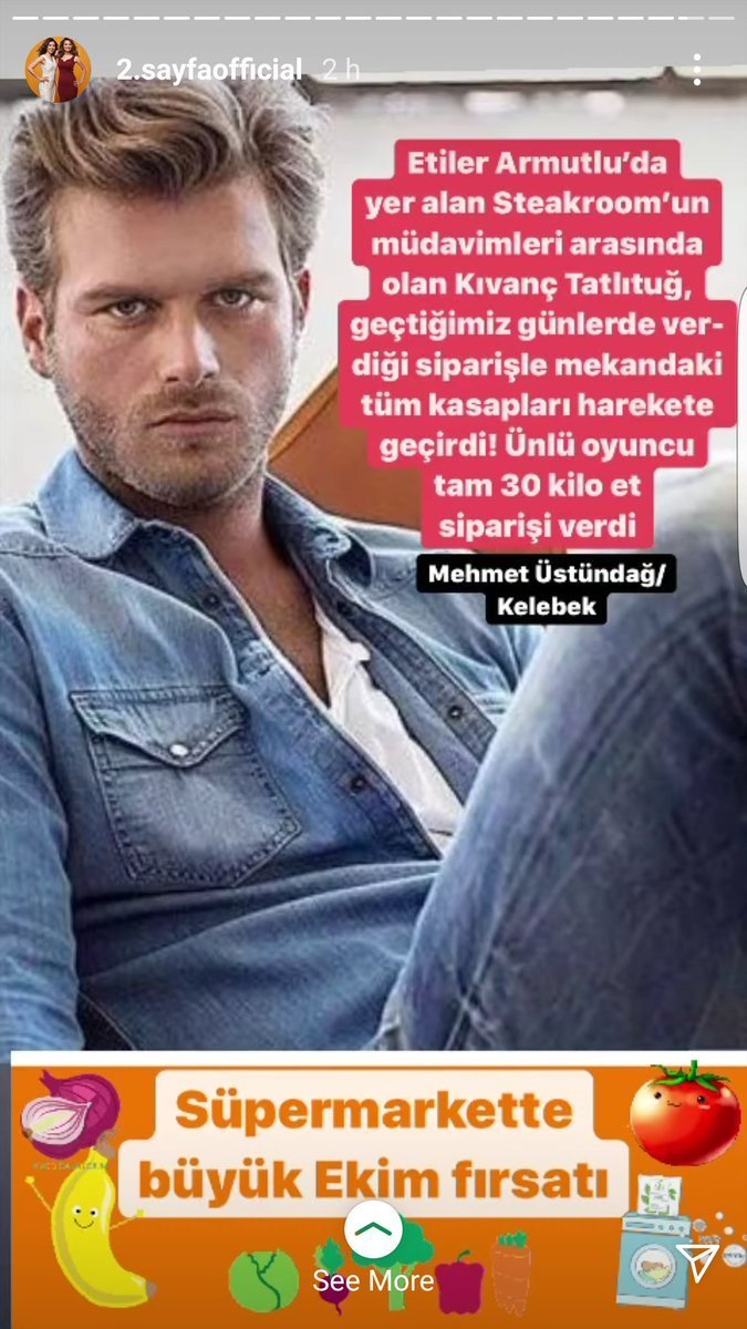 Известният актьор Kıvanç Tatlıtug е един от редовните посетители на ресторанта Steakroom, разположен в Armutlu. КТ, който обича да яде и купува месни продукти в Steakroom, наскоро включи всички месари от магазина със своята поръчка. Защо красавецът е купил 30 кг месо: дали за парти за барбекю, или за да го замрази, остава загадка. Но едно е ясно, че Kıvanç Tatlıtug и съпругата му Basak- дължат физическата си форма на диета, основана на протеини!