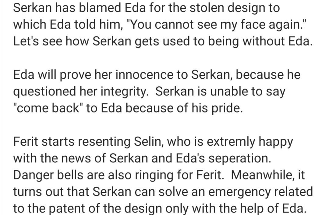 Серкан обвини Еда за откраднатия дизайн. Еда му каза: "Повече няма да ме видиш". Сега да видим как ще свиква да бъде без нея. Еда ще доказва невинността си на Серкан, защото той засегна много гордостта ѝ. Серкан не може да каже „върни се“ на Еда заради неговата гордост. Ферит се гневи на Селин, която не може да скрие щастието си от новината за раздялата между Серкан и Еда. За Ферит алармата е включена. Междувременно се оказва, че Серкан може да реши спешно проблем, свързан с патента на дизайна, само с помощта на Еда.
