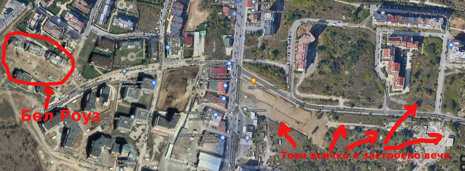 Това, което съм оградил е строящия се Бел Роуз 2. Това зад него, със зелените тревички и розовите покриви, е предишния Бел Роуз, който си е маркиран и със сивото пинче на Мапс.
