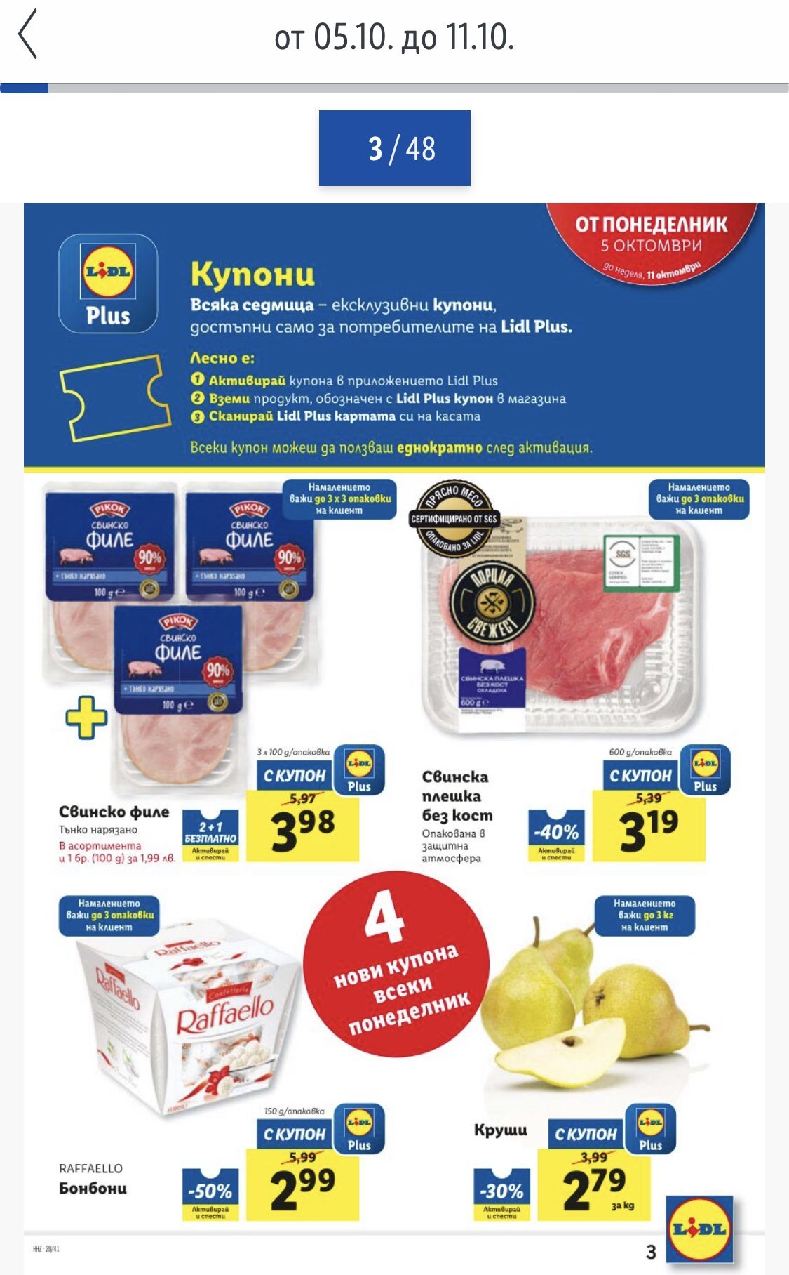 https://www.lidl.bg/bg/broshura/ot-05-10-do-11-10-broshura/view/flyer/page/1 Добро утро с новата брошура и наздраве с кафето Coffee!  Готино е приложението, само не ми харесва, че ще ми следят" потребителските навици" и по принцип съкровените ми, интимни отношения с Лидл Joy ( а и аз предпочитам физическа карта, която да ми дава процент намаление от цялата сума или от доста продукти в магазина или да се зачита по някакъв  начин крупната( за мен) сума, която оставям в магазина- един вид да поощряват и " награждават" клиентите, които пазаруват  по много , а сега ми е някакво мижаво на пръв поглед- оставям грубо над   600 лв, средно, на месец, в Лидл, а с това приложение се чувствам така- "Благодарим Ви за доверието и честито- получавате пакетче дъвки(ако закупите още едно)".Принципно купоните не са за нещо различно, а за нещо, без което бих могла- например мога да изчакам да намалят този продукт, а някои от продуктите , като месо и друго редовно са при намалени неща всекидневно. Това е моето мнение( нали е форум) и не бих искала да се заяждам  и не го насочвам към служителите на Лидл в темата, на които само искам да благодаря, че са толкова  компетентни, търпеливи ( тук и в Лидл- на работното си място),отзивчиви и дават страшно полезна информация Heart