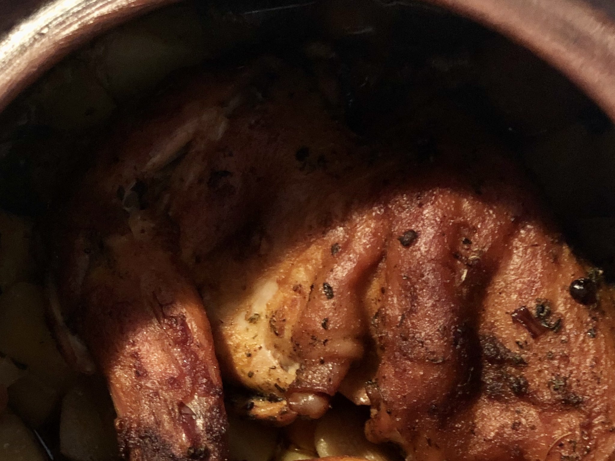 Отгоре хвана коричка, но не е сухо изпечен- надолу е сочно месцето.