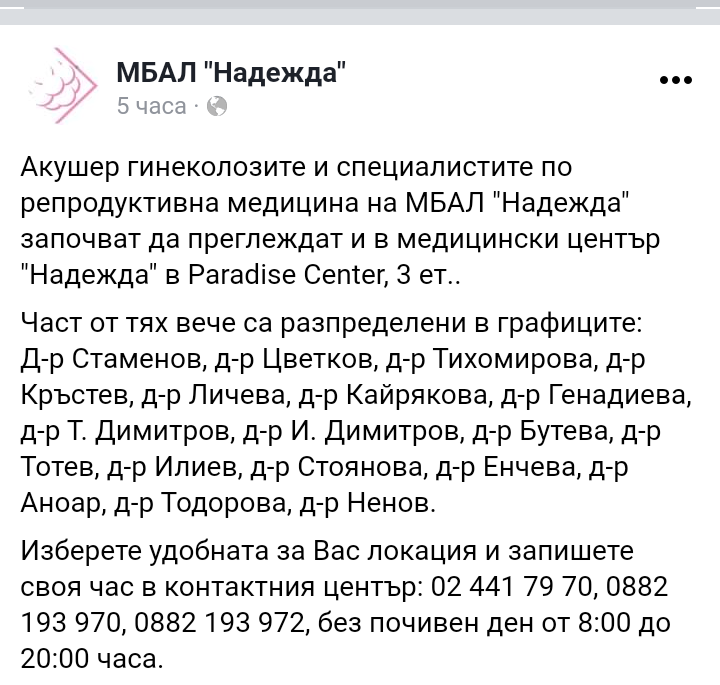 От репродуктивните специалисти кои ще преглеждат и в Парадайс?