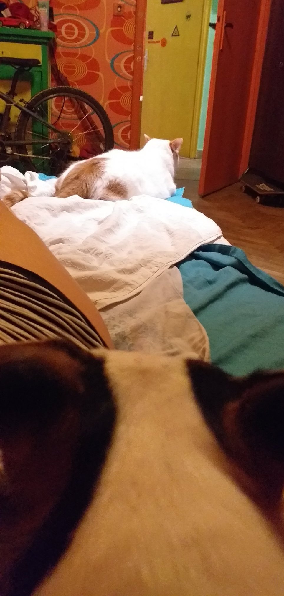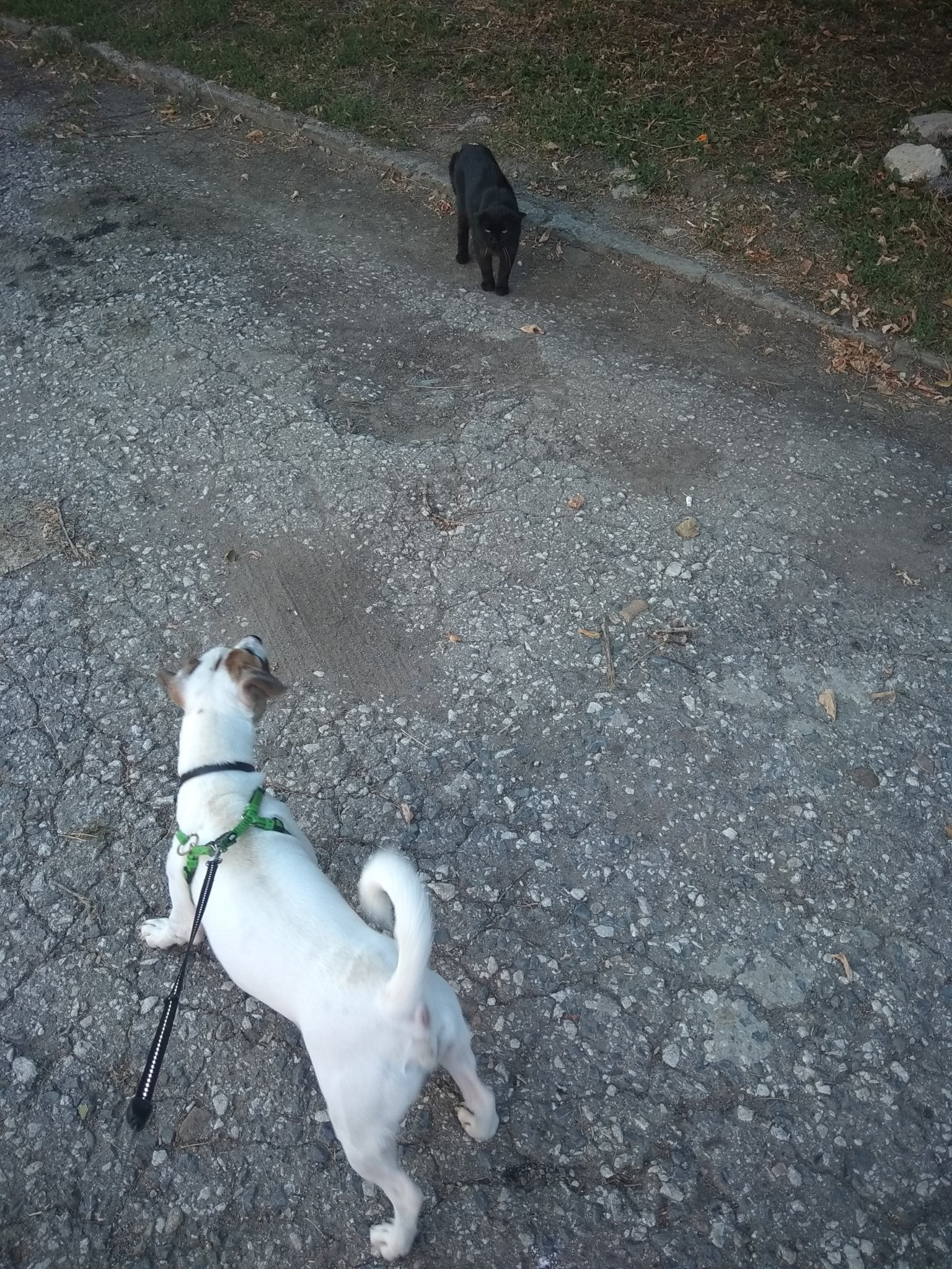 И моят звяр ги гони като бесен, все едно ако стигне котката от нея няма да остане и мустак, до момента в който на котката не ѝ стане досадно и каже вълшебната думичка"Сссссс"...  и стане невидима за Куч.....