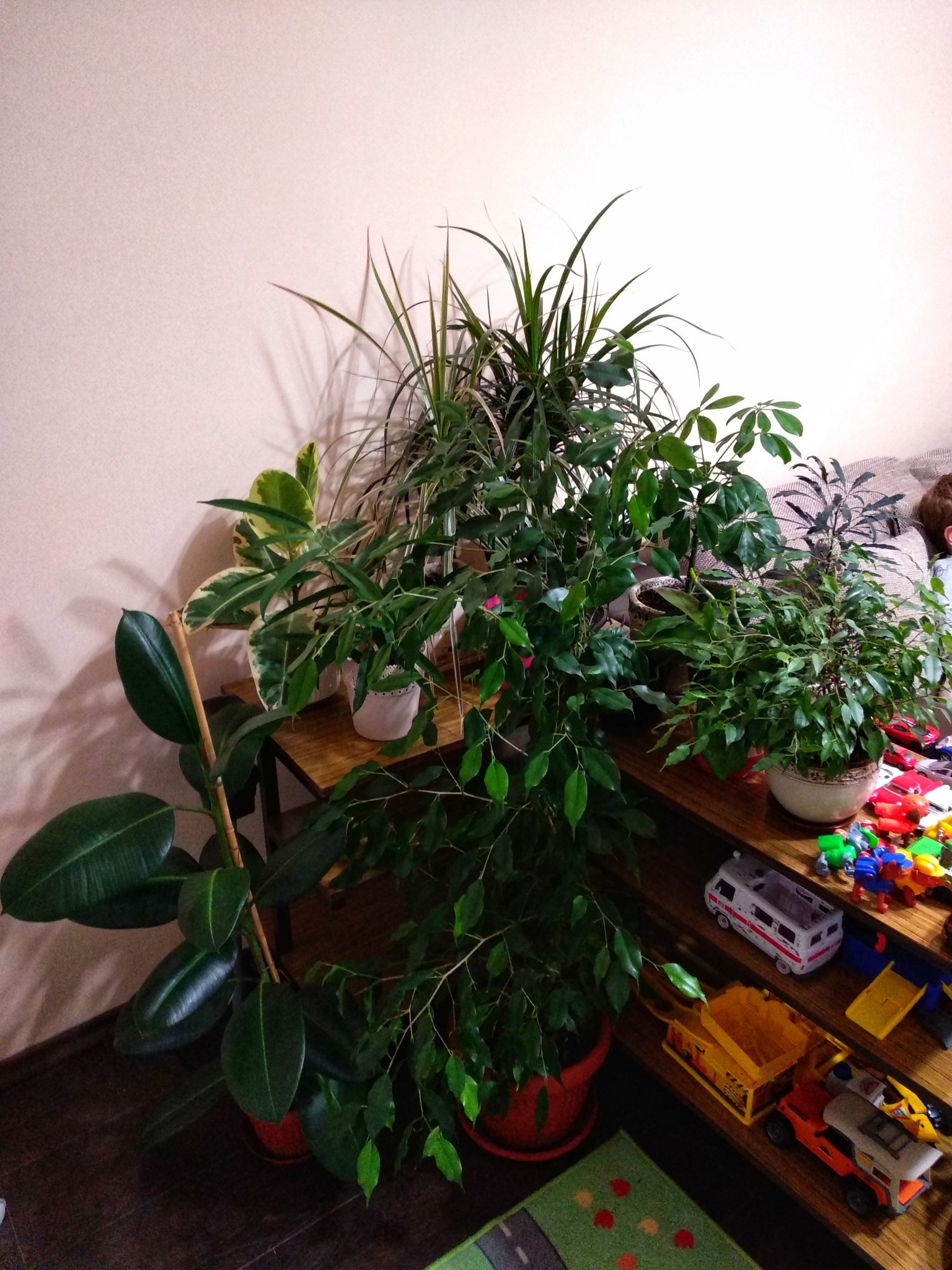 Растенията ми са : фикус Бенджамин 1.50 височина, фикус еластика с тъмнозелени листа (и той към 1.50), две драцени (една с тъмни листа, една вариегатна - по около 60-70 см), шефлера , юка, фикус Тинеке и фикус Али (по-малки - около 40-50см). Имам още и орхидеи, Ктенанте, малка дизиготека Simple Smile
