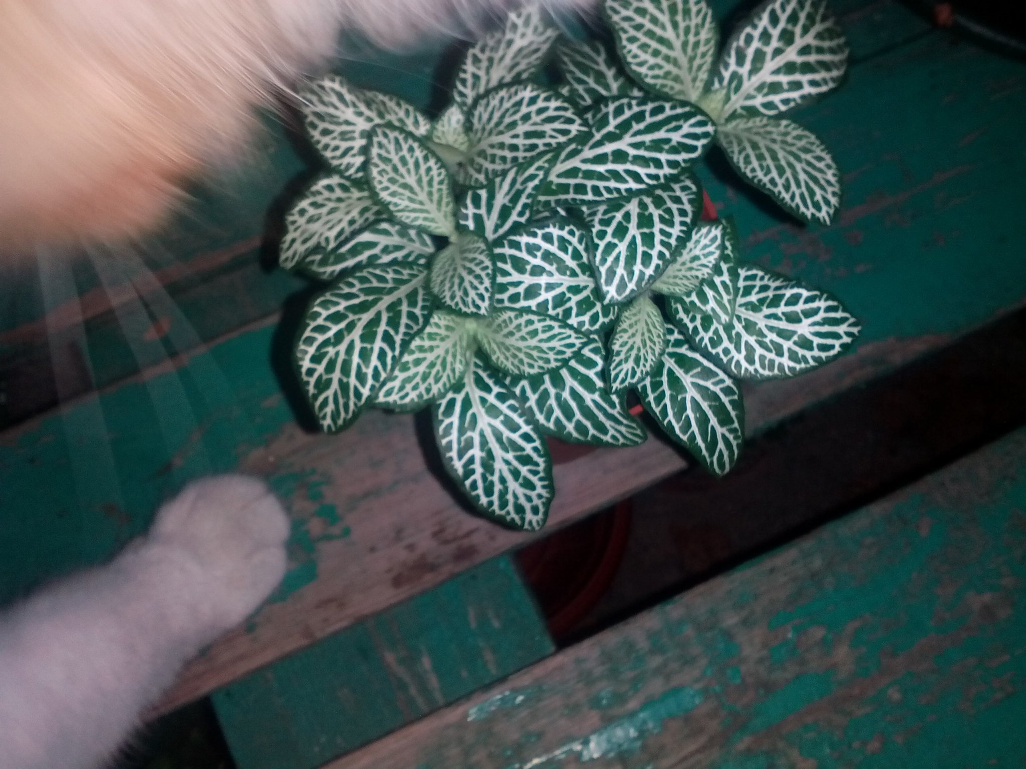 Нямам спомен дали съм показвала фитонията си (и част от котарака). Преди три дни се потресох как ѝ бяха клюмнали стъблата настрани. Полях я и след час пак изглеждаше добре. Все е жадна, милата. И нея я пресаждам, откакто я купих. Rolling Eyes