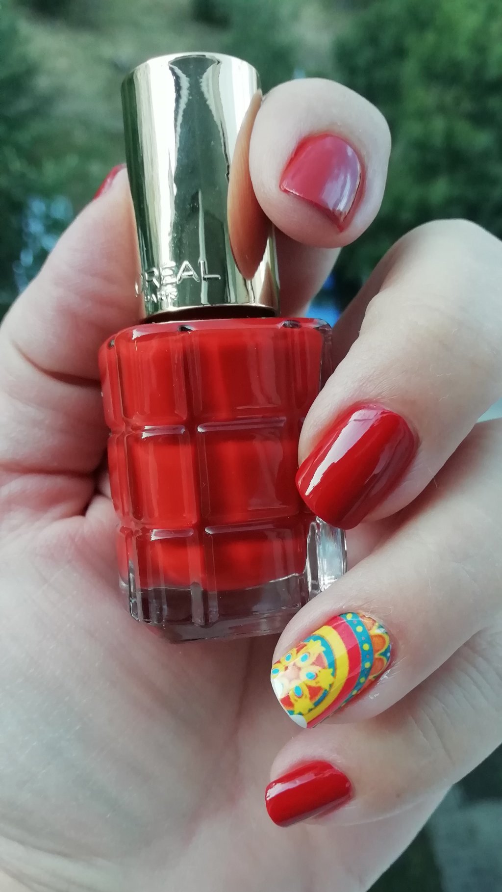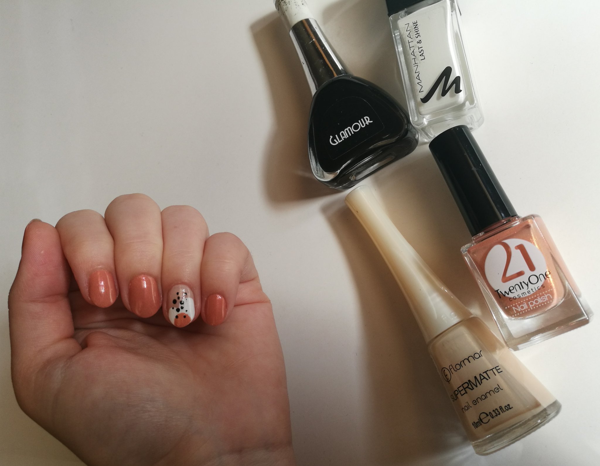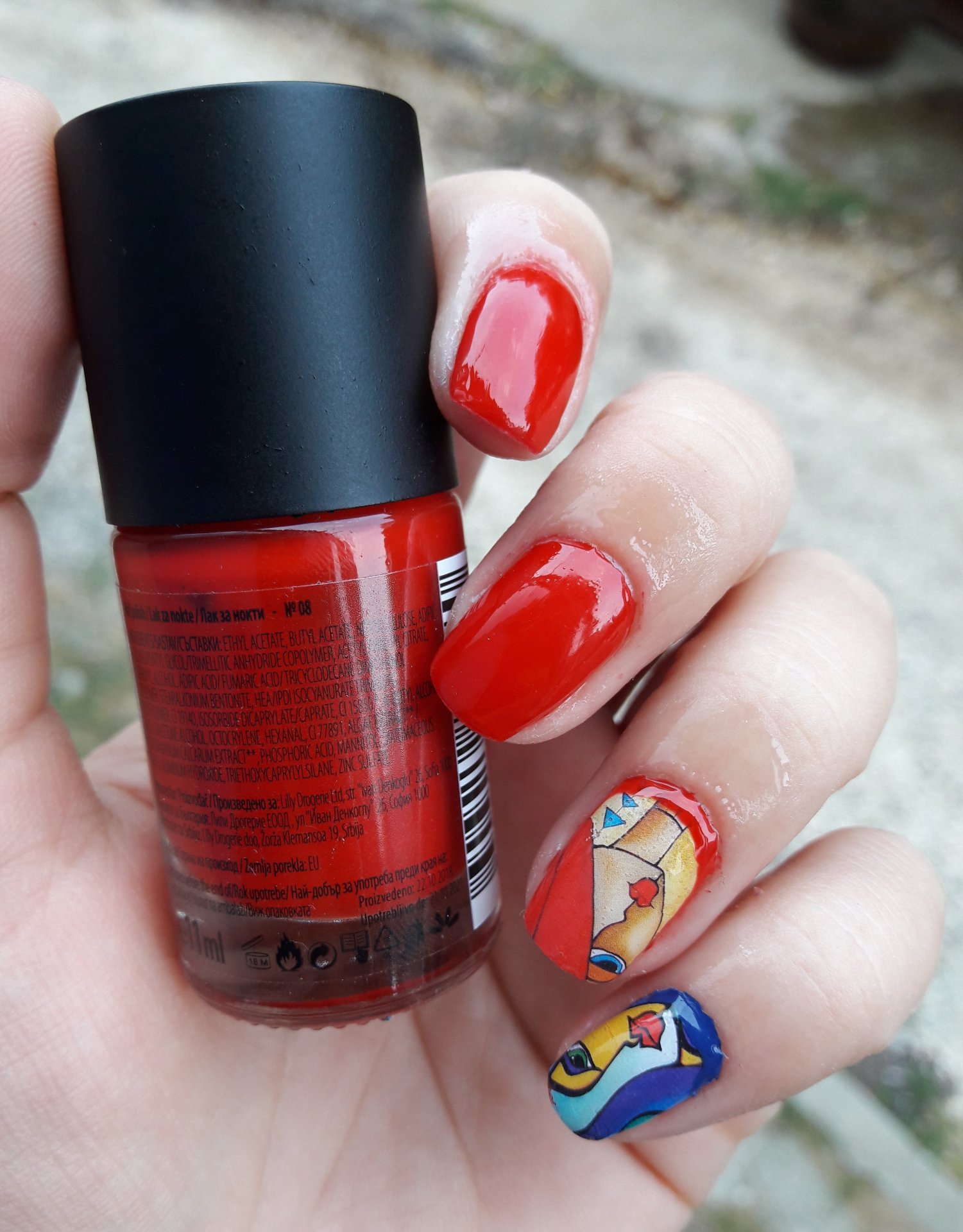 Основният цвят е Twenty One Cosmetics - 45, останалите използвани са: Flormar Supermatte - M124, Manhattan Last & Shine - 010 Paint it white и Classics Glamour - 178. Декорацията на палеца е направена с печат.