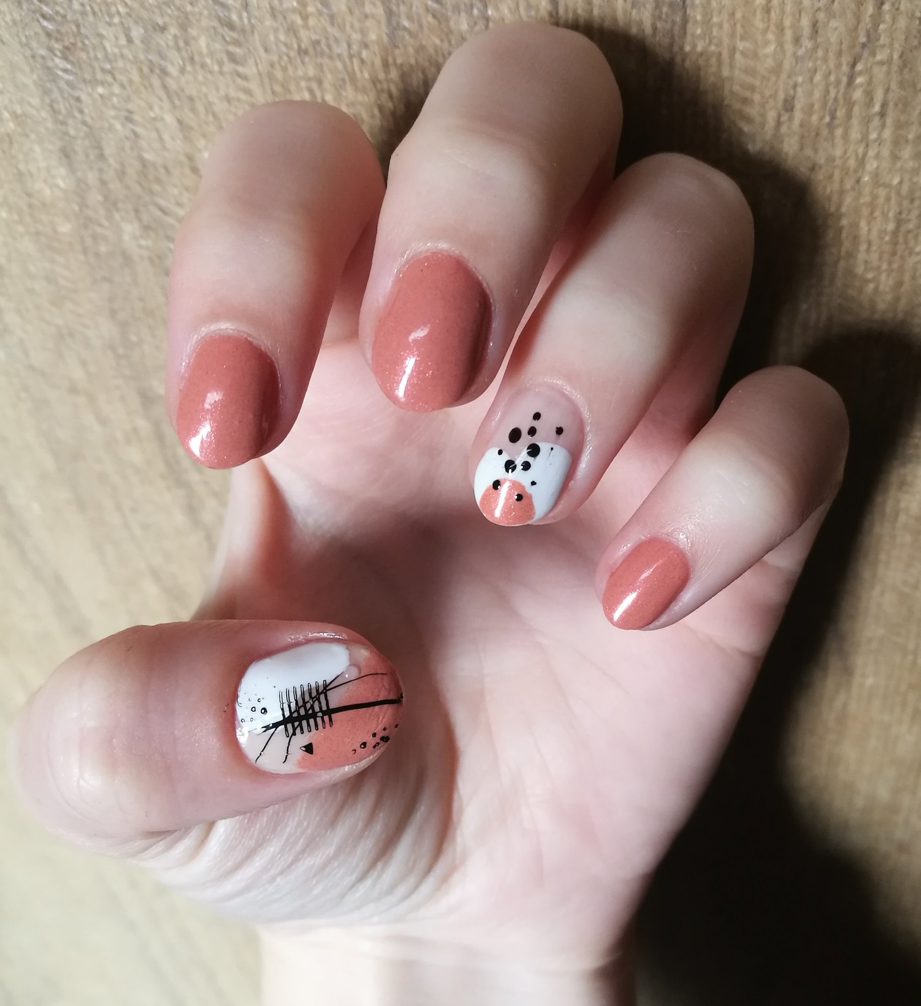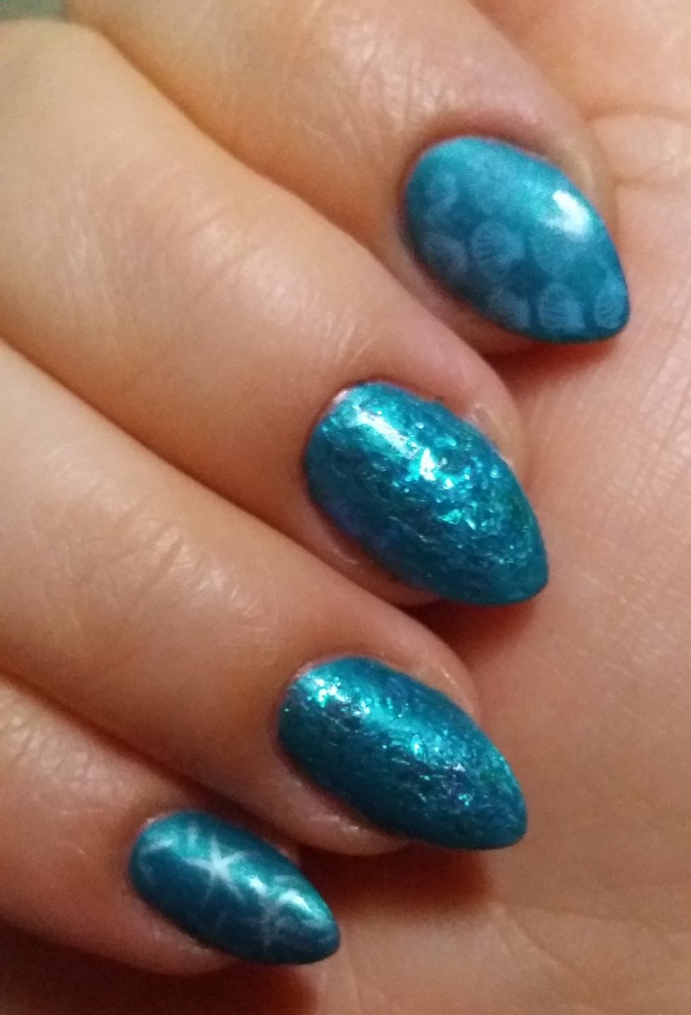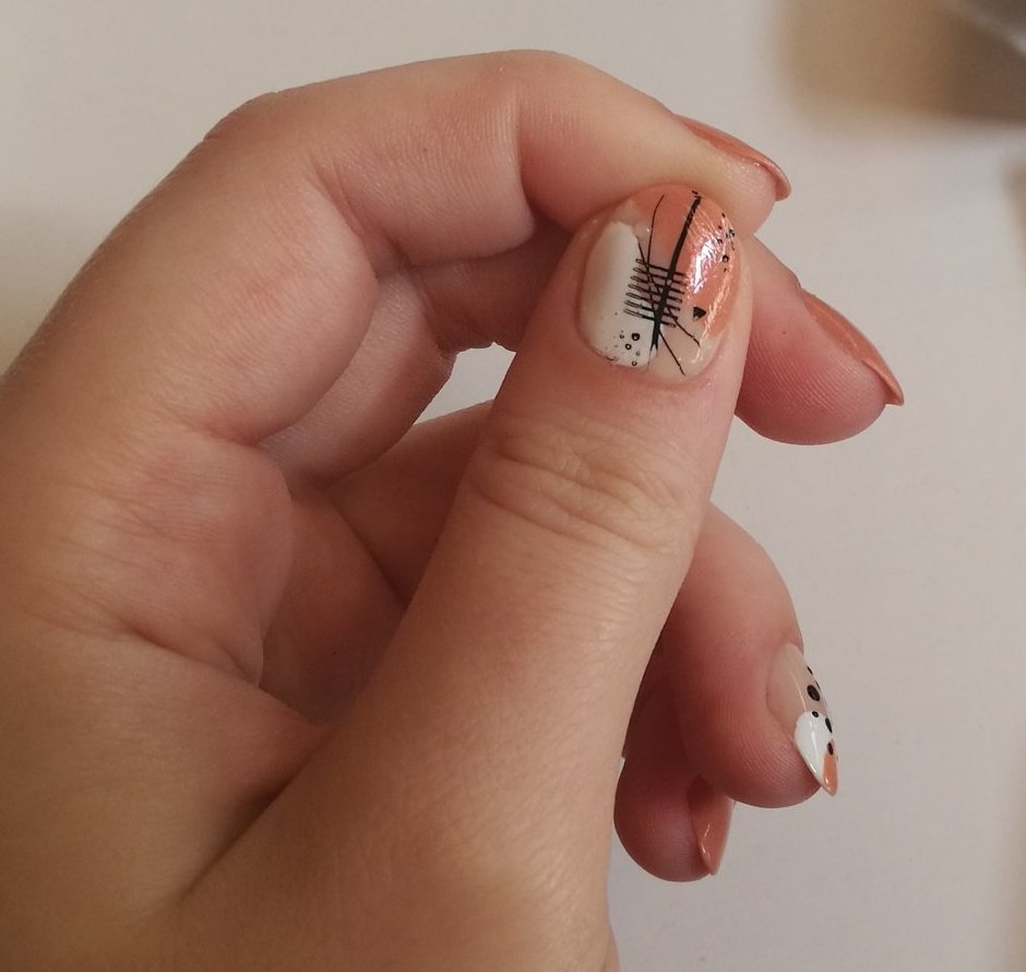Основният цвят е Twenty One Cosmetics - 45, останалите използвани са: Flormar Supermatte - M124, Manhattan Last & Shine - 010 Paint it white и Classics Glamour - 178. Декорацията на палеца е направена с печат.