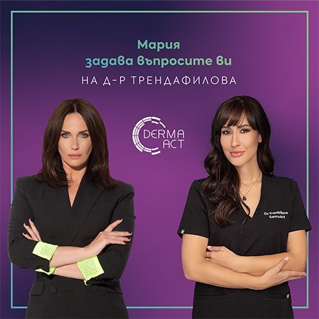 На 16 септември oт 19:30, в рамките на един час, Алекс Петканова, Мария Силвестър и Олга Модева ще предадат вашите нередактирани въпроси в лайвстрийм от Facebook страницата на Derma-act. Отговорите ще получите в реално време от водещи експерти на Derma-act – д-р Стиляна Трендафилова, д-р Мария Хаджийска и д-р Мариела Клаклова.