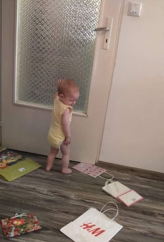 Пълзи много бързо, хваща се и се набира на шкафове, маси столове, кошарата, каквото хване. Малко е прекалено смела и не внимава хич как се хваща, на какво се набира, няколко пъти прави бум в някоя мебел 😵 Тя е мъничка 8.100кг на 9м, но е мнго активна, ще става май спортистка, не се свърта на едно място. Трябваше набърже да сложим закопчалки на всички шкафове и да скрием кабелите в кабелни кутии, защото отива веднага дърпа и яде. Вече се набира на масата за кафе в хола и нищо не можем да оставяме отгоре до ръба.