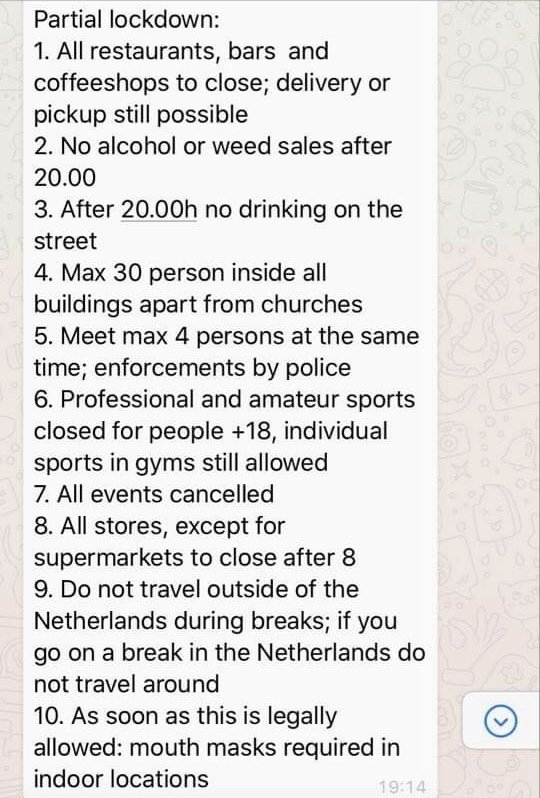 Реално това трябва да ви безпокои, след престоя в Бг дали ще се наложи да се самокарантинира. Предвид изказването на Рюте, че “The measures will be in place for (at least) four weeks. De Jonge stated that if these new measures were not followed, or if they were not effective, then a complete lockdown would be unavoidable. “ реално не се знае какво ще се случи..