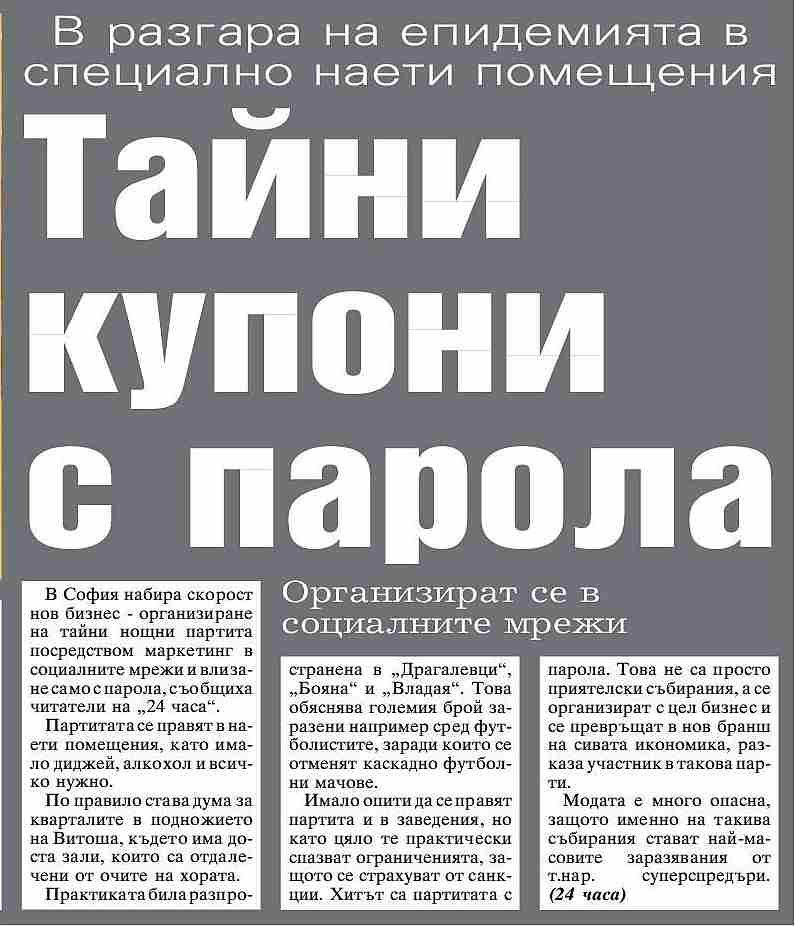 От днешния брой на хартиения "24 часа" - нещо в стил ЕЖК, но според мен си е доста правдоподобно. Бих се учудила, ако родният хайлайф се е кротнал след заварянето на нощните клубове и чалготеките.