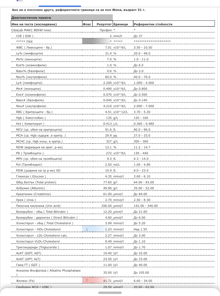 Моля за съдействие за разчитане на резултатите от кръвните ми изследвания. Безспокои ме косопад от няколко месеца, четох че ниския феритин може да е причина за него.