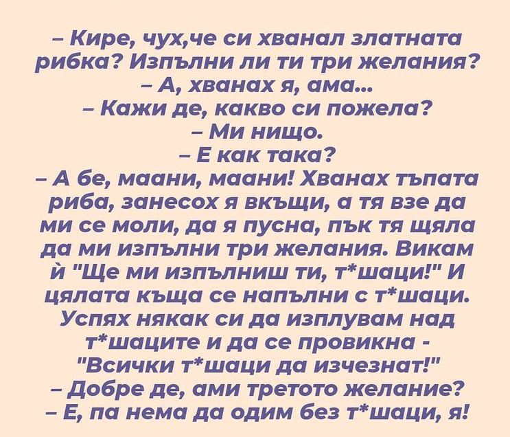 -Иванчо за какво мислиш. -За каквото и ти мислиш? -Марийке! -Боже за какво говедо се съм се омъжила.