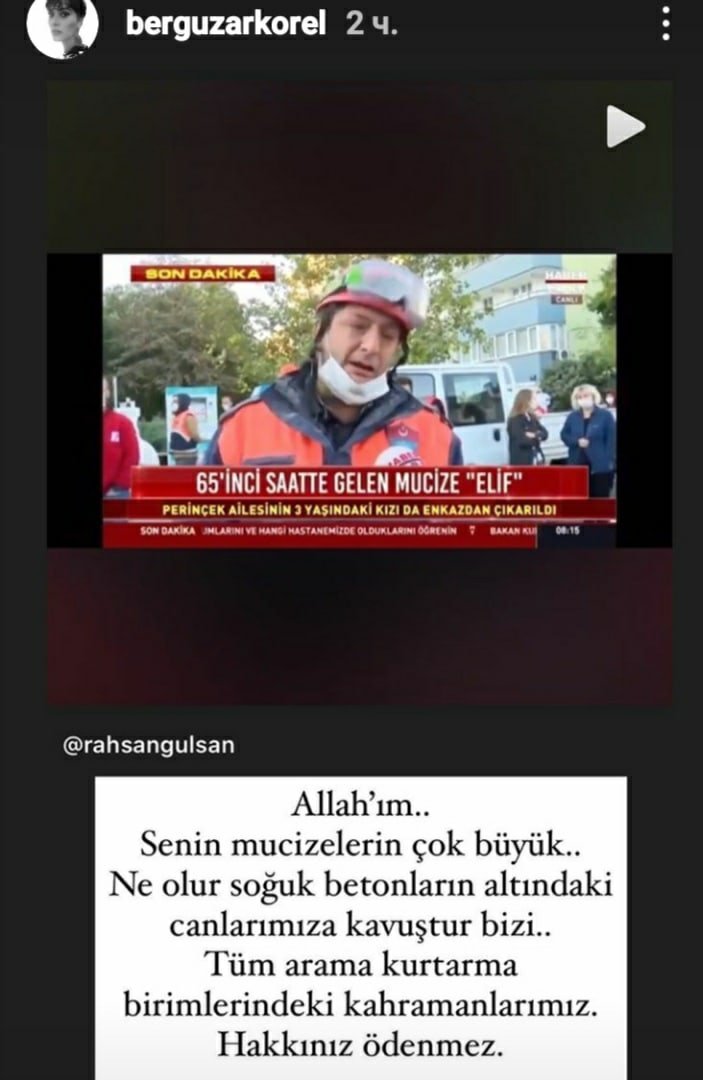 «Элиф чувствует себя гораздо лучше, чем мы ожидали», - сказал Толга Юнзель, фельдшер из Национальной поисково-спасательной группы Министерства здравоохранения (UMKE). «Мы также получили информацию из больницы: Элиф находится сейчас в реанимации, где ей оказана необходимая помощь.