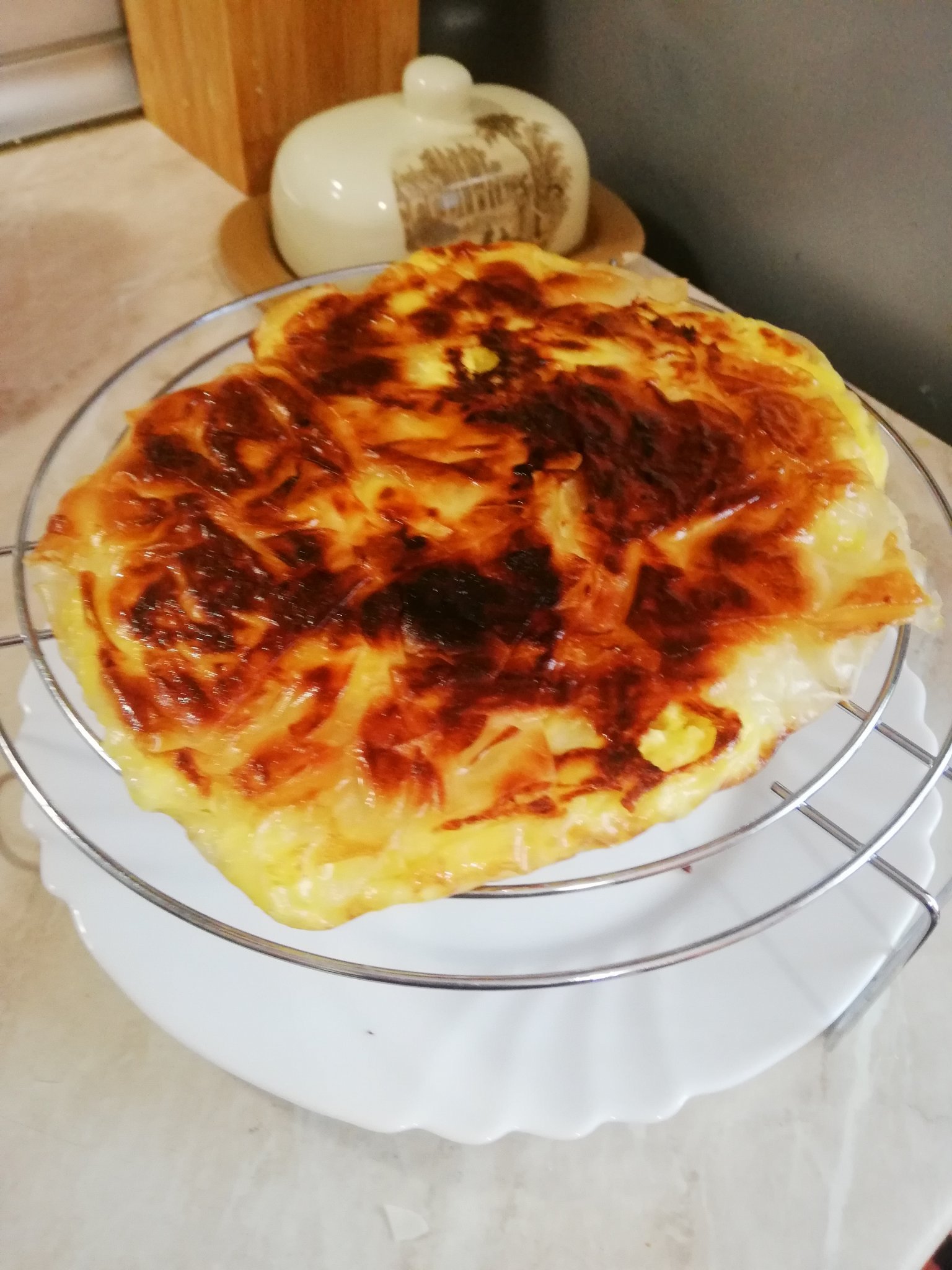 И, понеже вчера я правих, старозагорската карниера си е точно такъв хляб без месене, овкусен от  намазката най-отгоре. Бърза е, забърках тестото и изсипах в добре намаслена тава, сложих сиренето, маслото и яйцето отгоре и в студената фурна. Получи се това:
