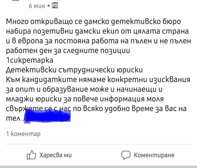 Кандидатки има ли? Ако имате подходящото образувание, много откриващото се дамско детективско бюро Ви очаква. Joy