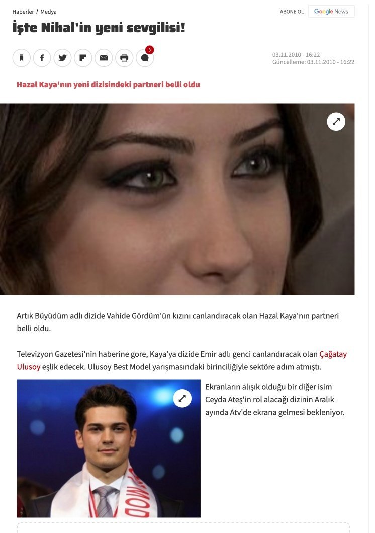10 лет назад 3 ноября 2010 было объявлено о том, что Хазал Кая будет сниматься в новом сериале телеканала ATV "Теперь я выросла". Новым возлюбленным ее героини станет победитель конкурса Лучшая модель Турции Чагатай Улусой. Сериал в конце концов оказался на телеканале Show TV, изменив название на "Я назвала ее Фериха"