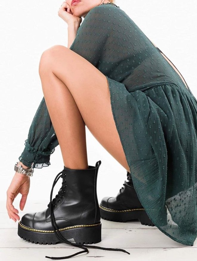 Искрица, освен кубинки и тънък ток, може и с кожена пола, шорти или клин и подобни чизми. Миналата година взех от Зара такъв модел (или почти същия) , само че в черно, много са удобни!