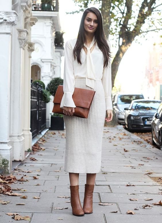 Надолу беж, нюд светло кафяви чорапи и боти, чанта с някой от цветовете на шала.