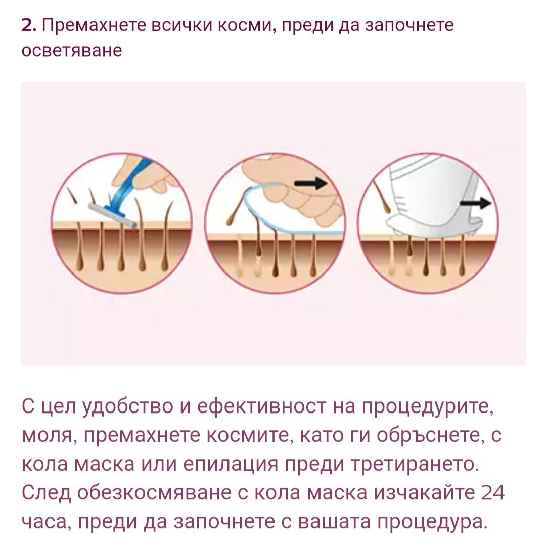 Забелязах, че на първата страница пише, че се минава човек с фотоепилатор, след като си е премахнал космите 2-3 дни след премахването на космите, за да са се появили малко! Много странно...! Ако правилно съм разбрала инструкциите на моя уред, това не е добре за лампата му. Не съм го правила, а ефекта е постигнат на 100% и за ръцете и за краката. Винаги си махам космите с бръснач и след това още същия или най-късно на следващия ден с епилатора!