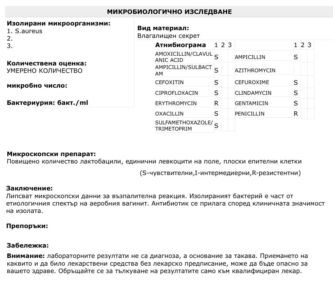 Резултат:Нормална аеробна бактериална флора. Candida spp. (-) отр.