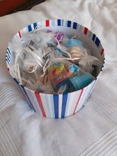 Картонена торта правя вече 3та година. Купила съм две цилиндрични кутии от Джъмбо, сложила съм ги една върху друга и ги украсявам тематично всяка година. Вътре слагам платнени торбички пак п джъмбо, във всяка има свирка, пакетче желирани бонбони от тия от Лидл в големите пакети, киндерче от лидълките и  още нещо дребно, тоя път бяха едни печати от Пепко.