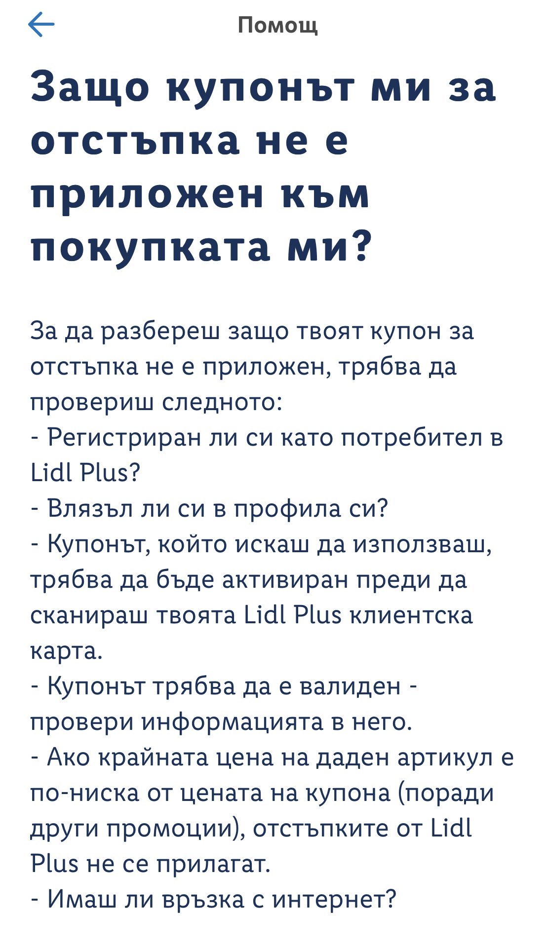 Много се разочаровах....в 15,30 в Лидъл Русе, ул. Чипровци, нямаше нищо от тея неща с купоните. А и тая система е мега бавна. Касиерката явно има задължение да пита всеки дали си е инсталира приложението. Хората, особено по- възрастните проявяват интерес и питат, тя дава брошура, те продължават да питат, опашката се трупа , ставаме един връз друг /пандемия бай бай/ .Аз се опитах да се чекирам , не стана, но тъй като нищо с купони не бях взела, се отказах. Касиерката настояваше, даже ми искаше телефона. Е там вече ме загуби  и повиших тон, казах й да си маркира продуктите и да си ходя. Определено няма да стъпя тази седмица отново там.