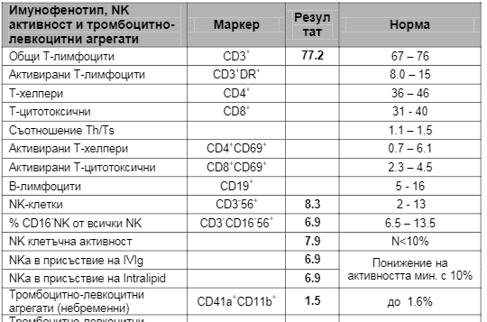 НК клетки съм изследвала само веднъж, 1 месец след миседа ми. Тогава решихме да ги пуснем, защото търсехме причината за миседа, която впоследствие се оказа генетична аномалия. Та тогава при горна граница 12 моите бяха 26. На последвалия след няколко месеца трансфер правих вливка на Интралипид, но опита завърши с кръгла 0, което може да се е дължало на некачествен ембрион.