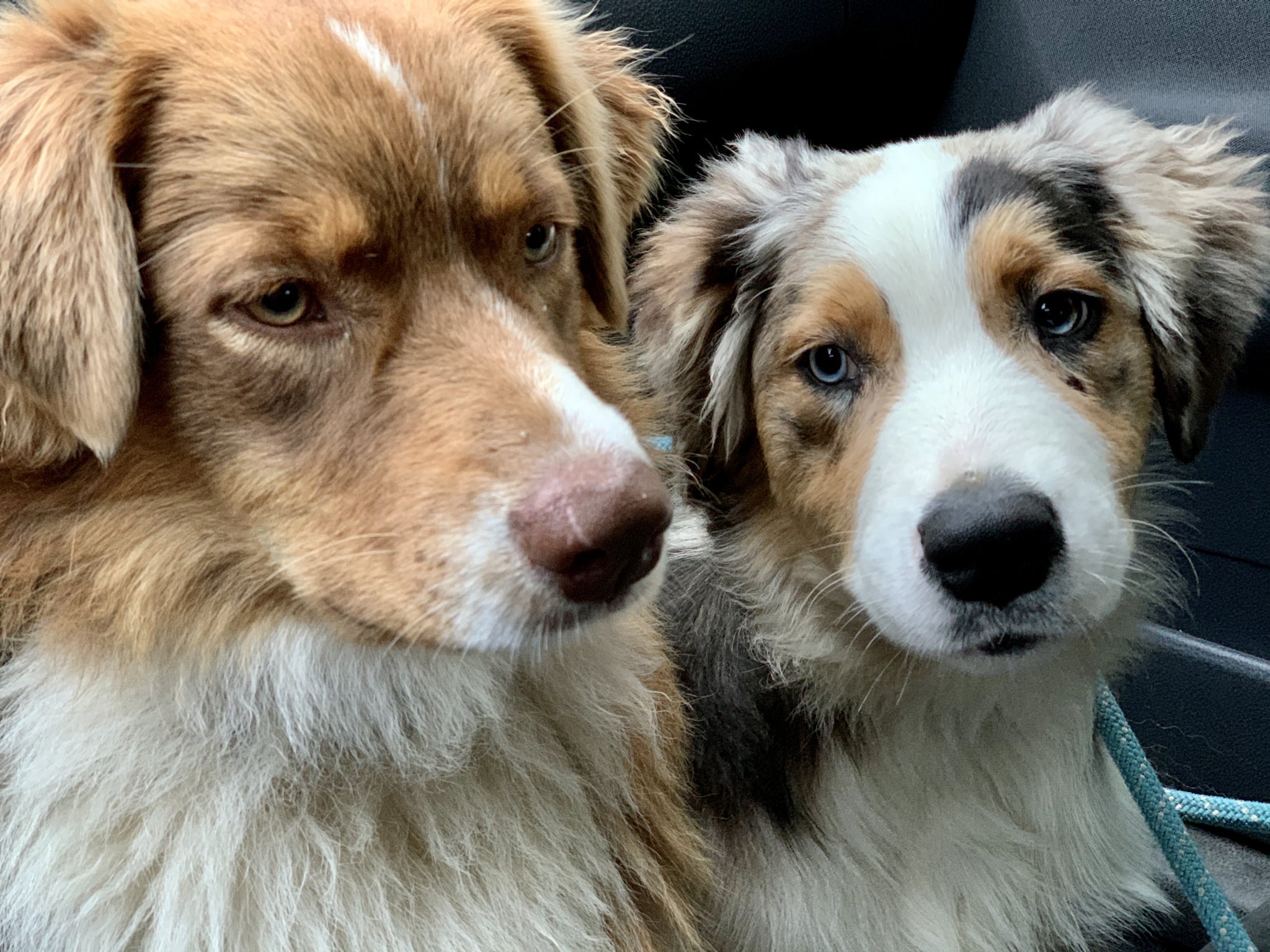 Нашите нямат проблеми в колата. Ние ги возим всеки ден до пътеката в планината, а и много пътуваме като цяло. Тренирани са. Издържаха 10 часово пътуване без да гъкнат - Мокка беше на 7 месеца, а Нъки на 3. Според мен с тренировки и постоянство всичко се постига. Тук са в колата: