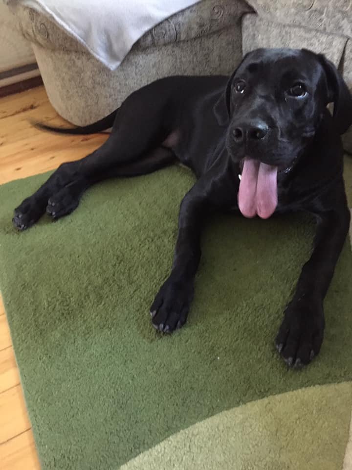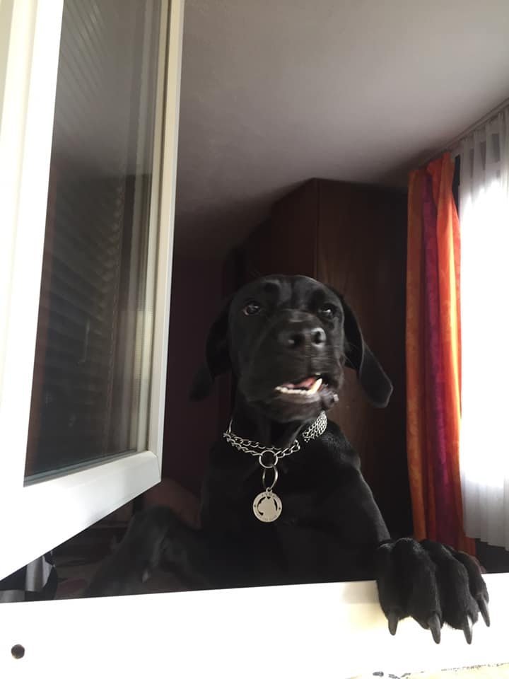 Голяма забава е,вечер като се съберем на вечеря полудява да скача покрай нас и да ни гуши и целува.Ама се гуши като човек.-изправя се на задните крака и предните лапи обвива около врата на човек.И слага глава на рамото.
