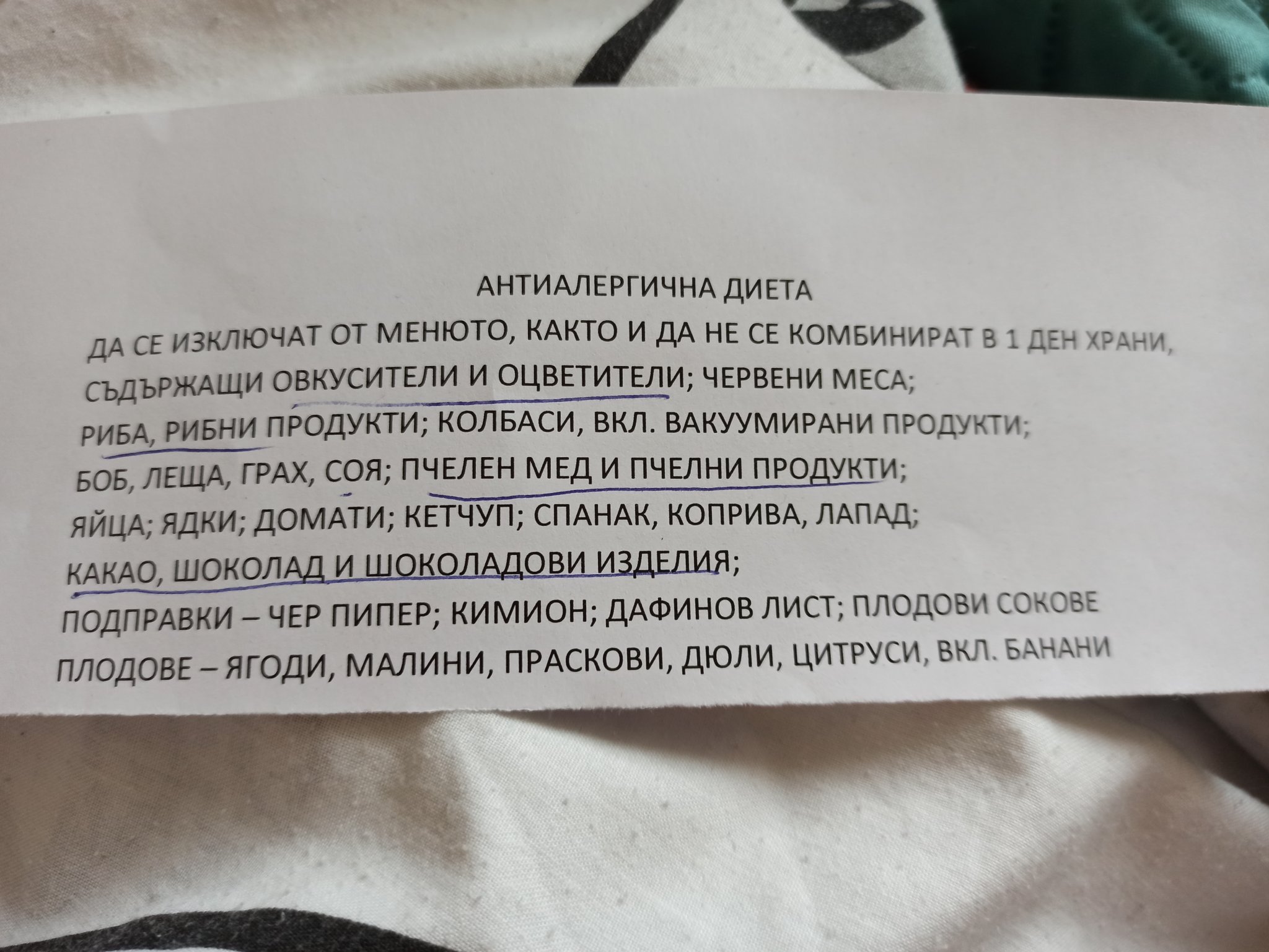 Наистина е безумен. До вчера го спазвах с триста зора,но започвам да ям по малко и от тези храни,ако има нещо то ще си проличи. Все пак, все някога и той ще се сблъска с тези храни,по-добре да е първоначално чрез кърмата. Смятам само да огранича прясното мляко, меда, бобовите, цитрусите и шоколада,понеже от него пък май му излязоха пъпчици по тялото .