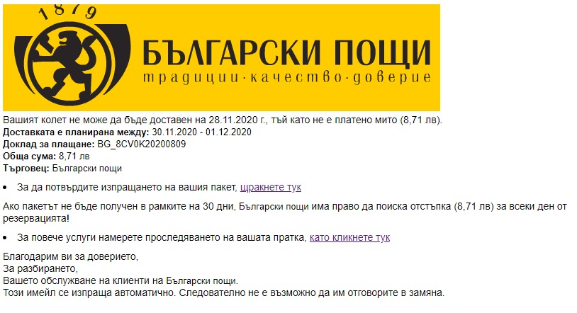 Предимно чета темата, рядко пиша, но се включвам да кажа, че този мейл е фишинг. Получих абсолютно същия, с абсолютно същата сума, която "дължа", но с малката подробност, че не чакам нищо по БП, още по-малко с дължимо мито. Не отваряйте линковете!